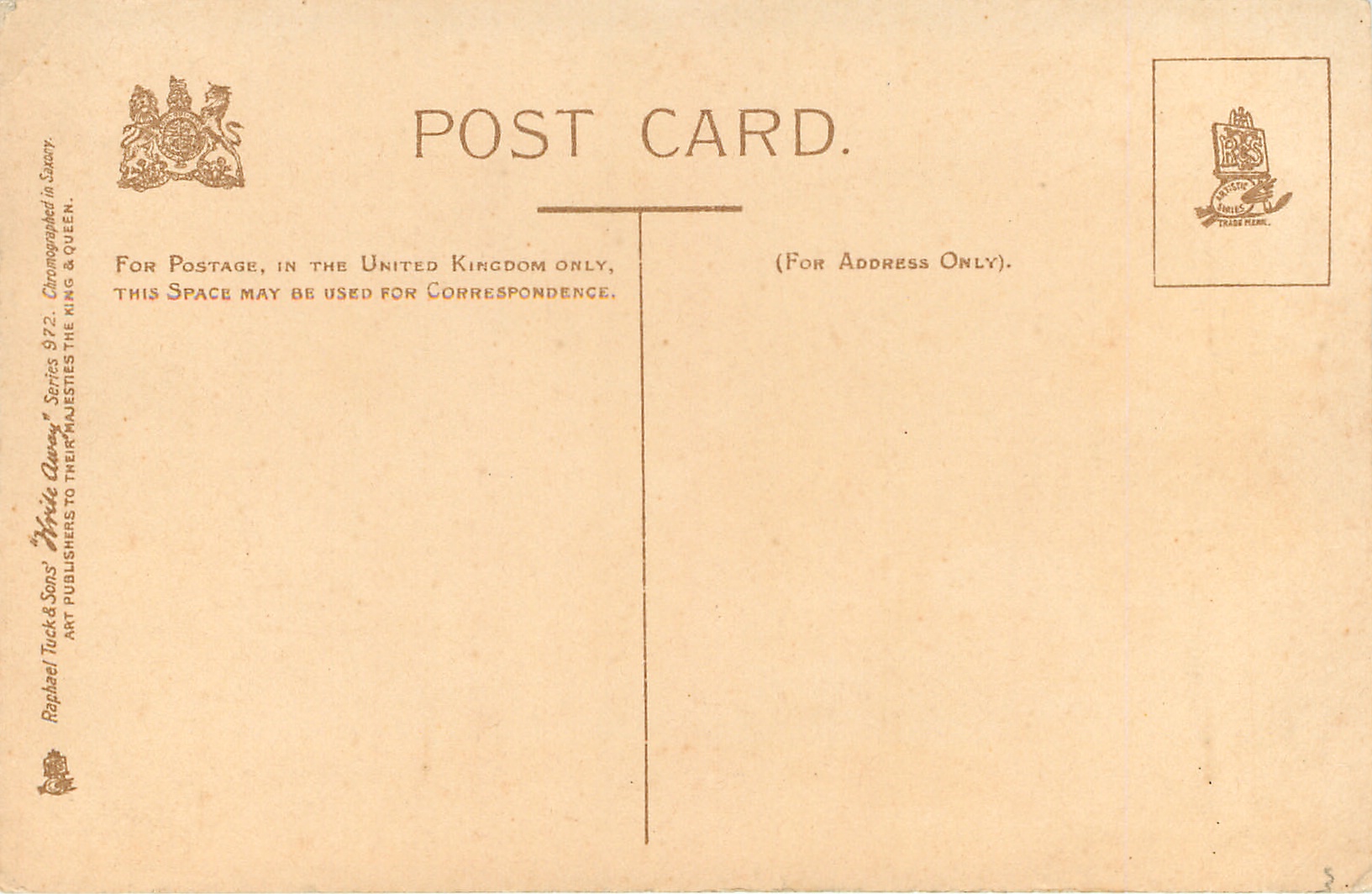 WRITE AWAY, u/b, DESIGNED IN ENGLAND, CHROMOGRAPHED IN SAXONY, d/b CHROMOGRAPHED IN SAXONY, listed as Write Away Designs in 1904 & 1908/1909 & 1911/1912 & 1913/1914 Postcard Catalogues