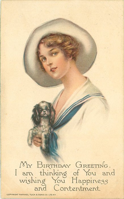 MY BIRTHDAY GREETING, I AM THINKING OF YOU AND WISHING YOU HAPPINESS AND CONTENTMENT pretty girl in sailor suit cuddling small spaniel