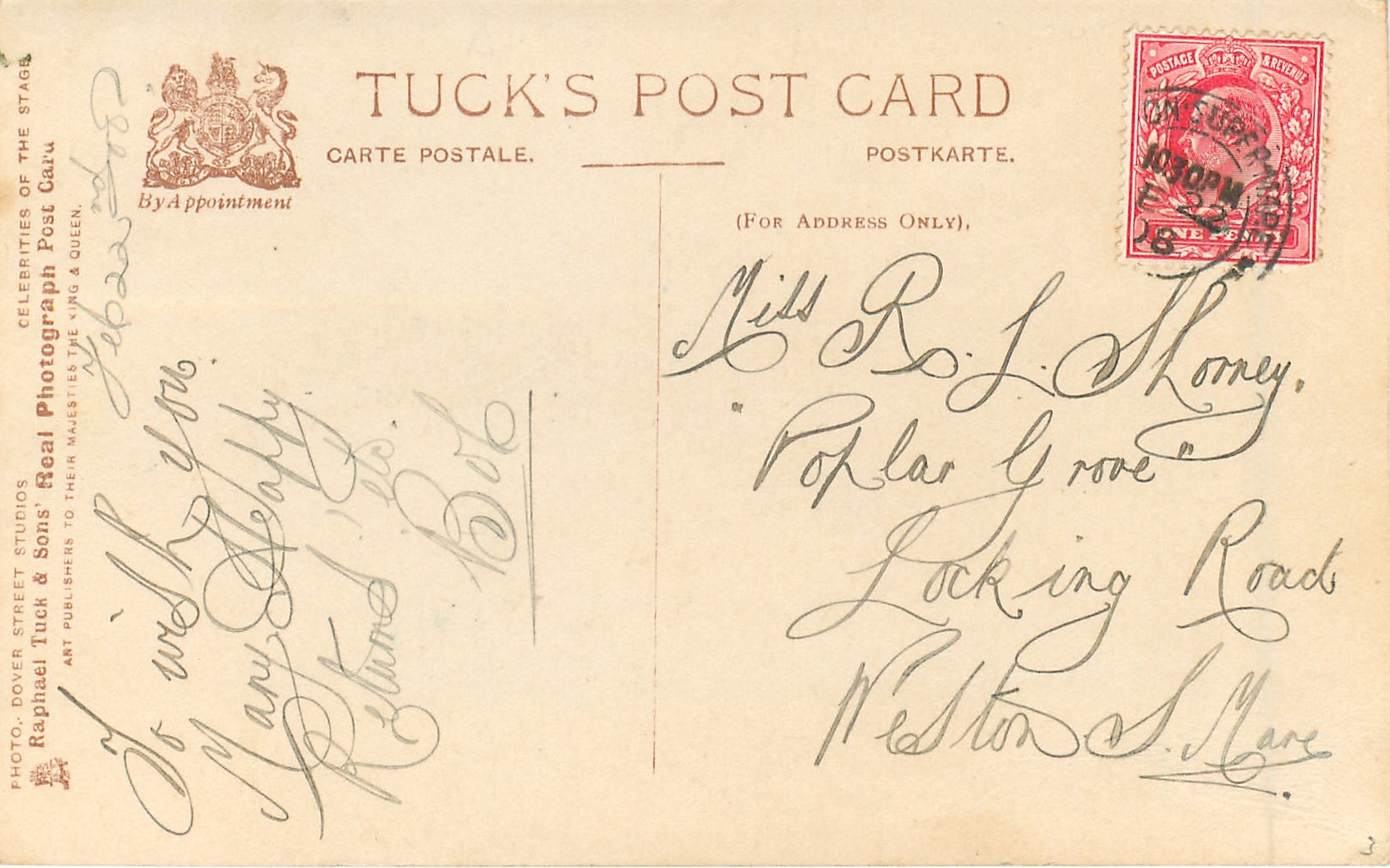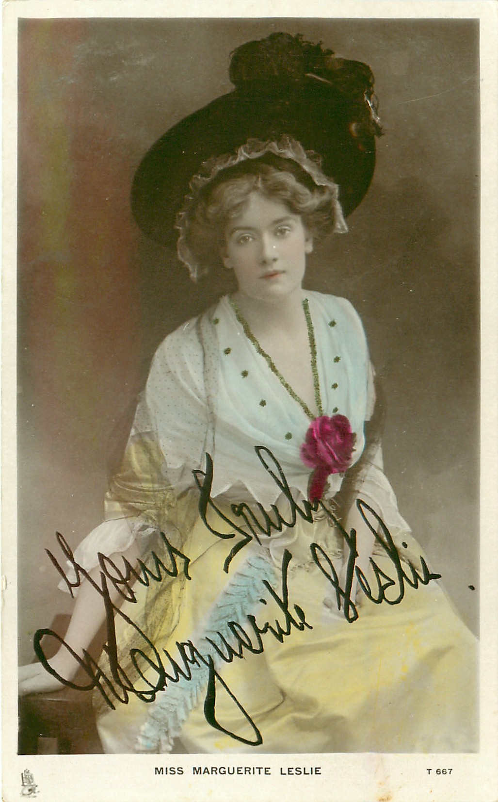 with facsimile autograph & painted flower corsage, Marguerite Leslie (1884 Sweden-1958) was Lady Delbeck in "The Beauty of Bath" Aldwych Th. London 1906 (287)