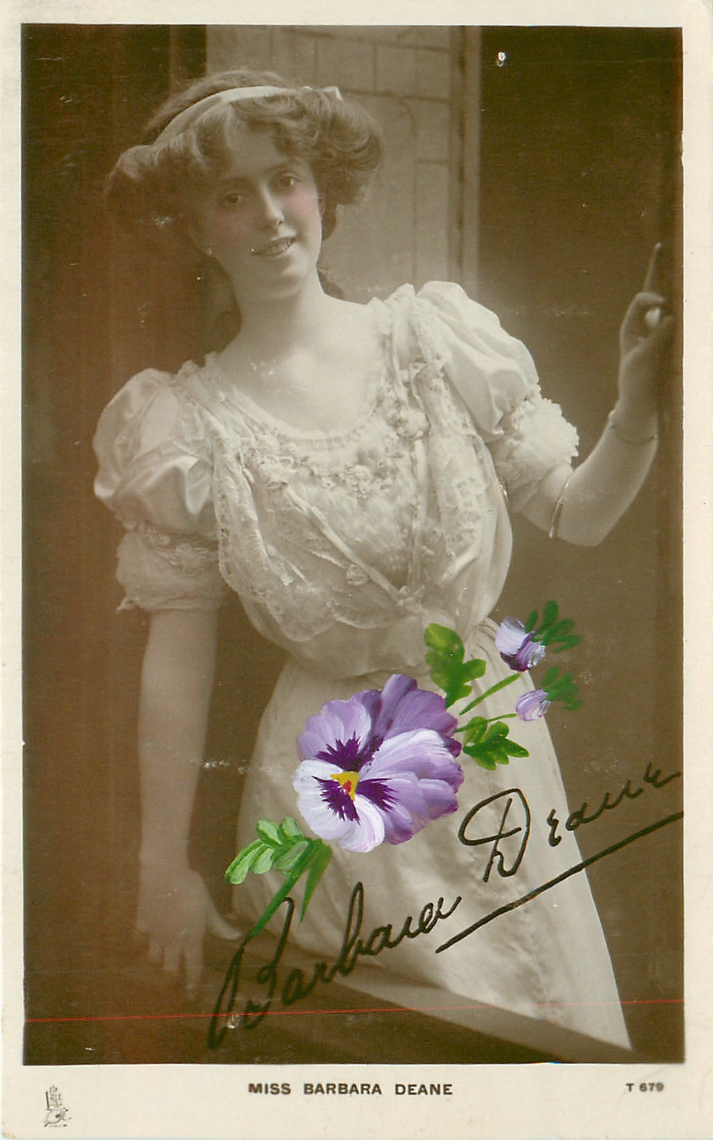 with facsimile autograph, & painted flower Barbara Deane (1886- ) was Mary McLeod in "The Gay Gordons" Aldwyth Th. London 1907 (229)