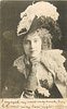 woman in riding attire & elaborate hat trimmed with ostrich feathers, facing front with chin on gloved hand