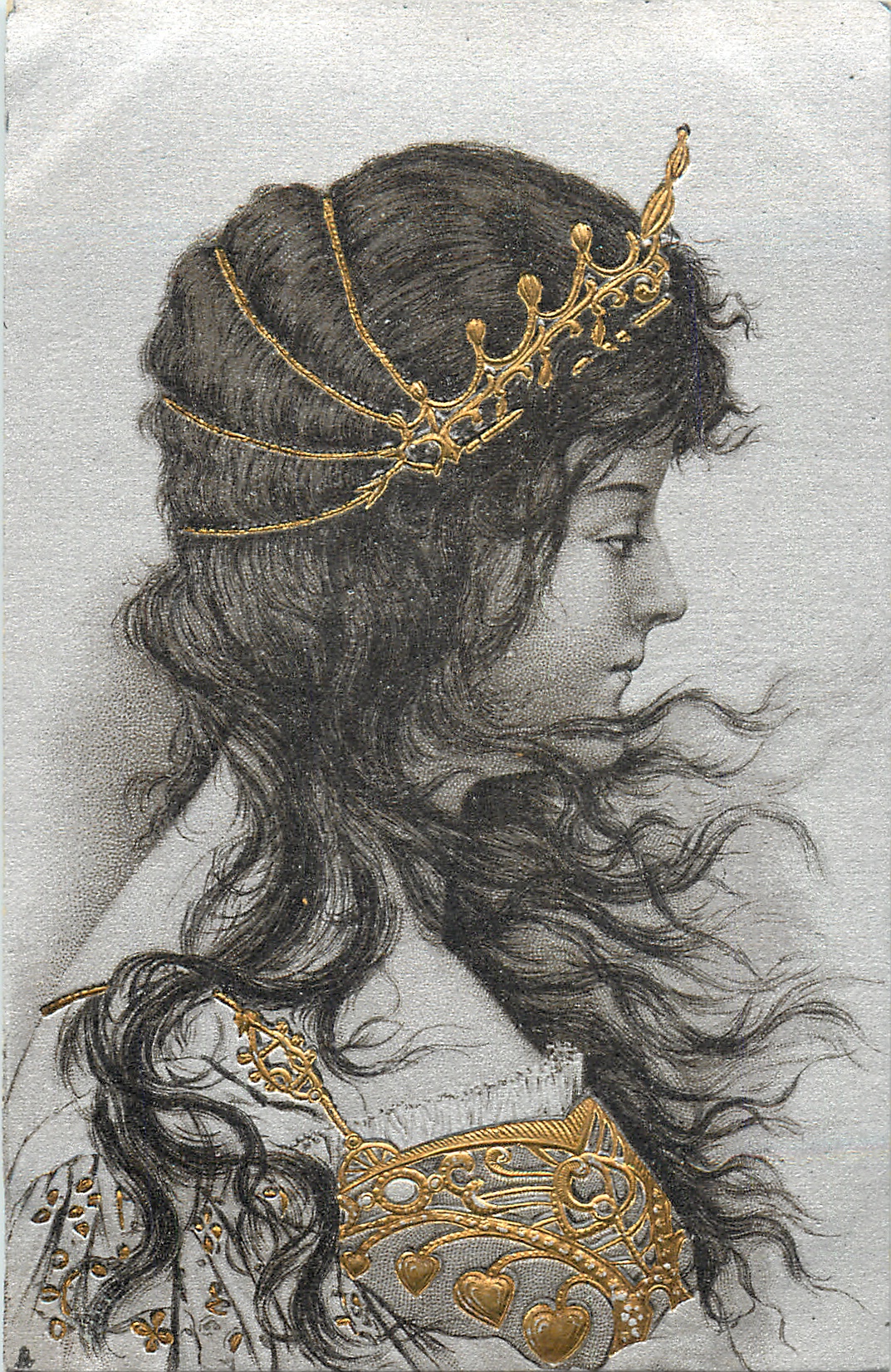 woman facing right, head piece held on with four bands at back, no neck beaded, very long hair