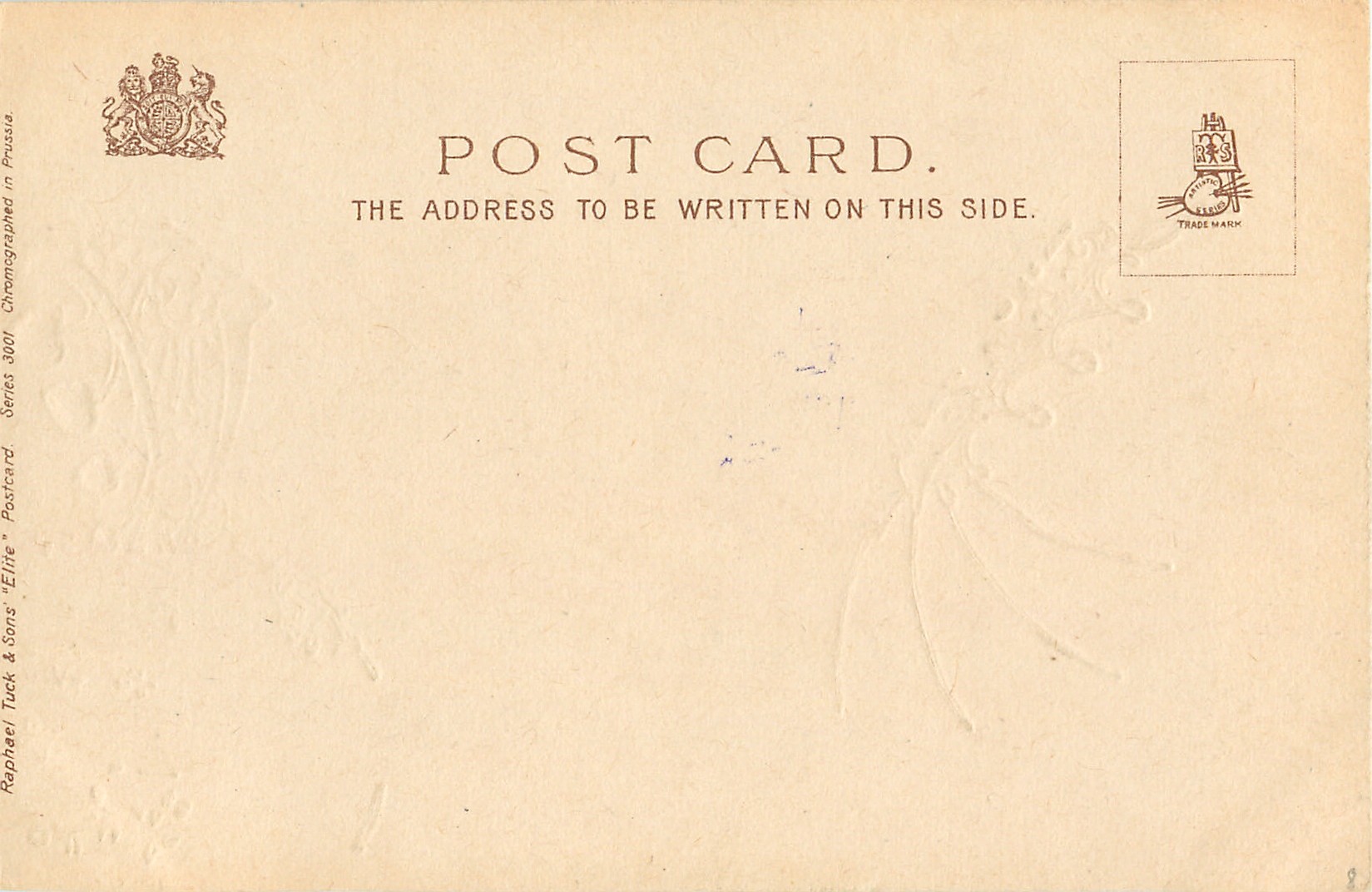 ELITE, u/b, embossed with gilt inlay, CHROMOGRAPHED IN PRUSSIA, listed in 1904 POSTCARD Catalogue