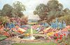 pond with fountain front centre, grass path behind leads away, many flowers both sides