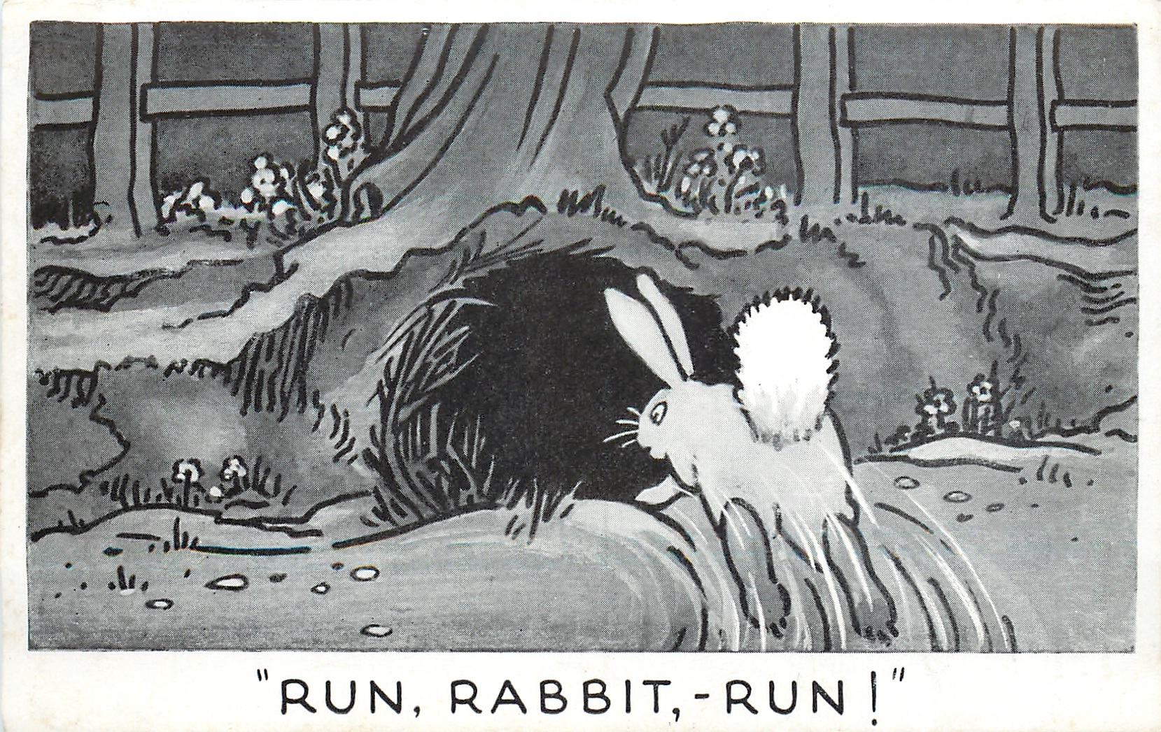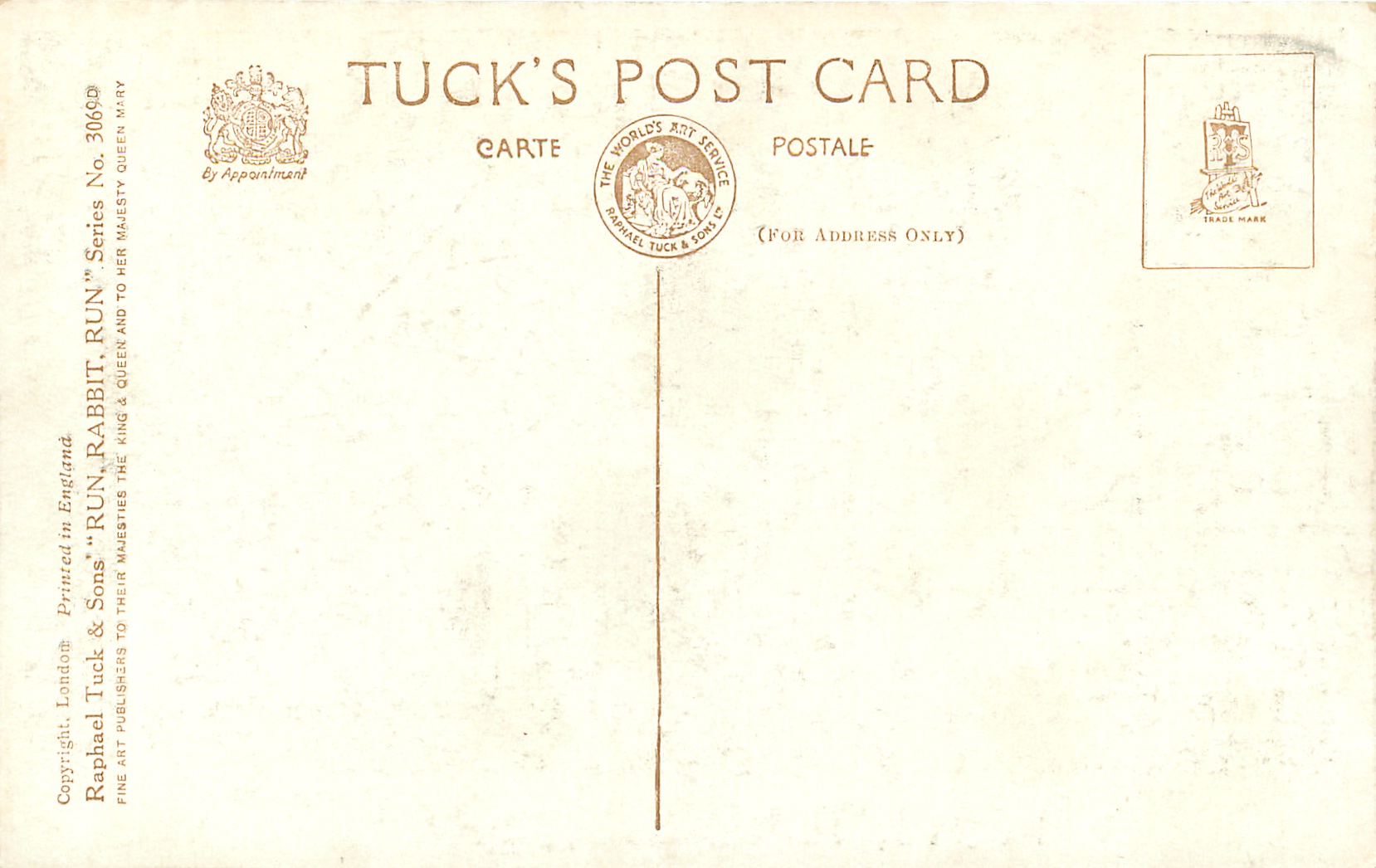 "RUN, RABBIT, -RUN!", PRINTED IN ENGLAND, COPYRIGHT LONDON, come with suffixes, come with & w/o Tuck easel on front