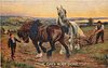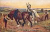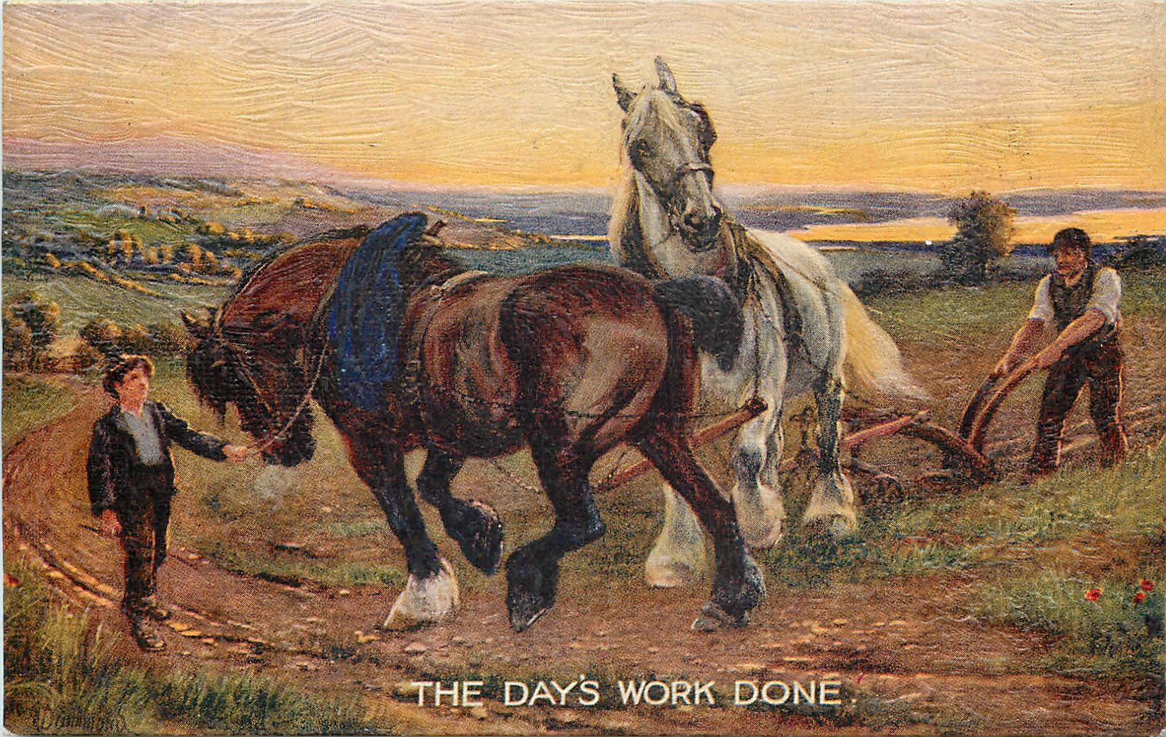 THE DAYS WORK DONE brown & white heavy horses being turned at end of furrow