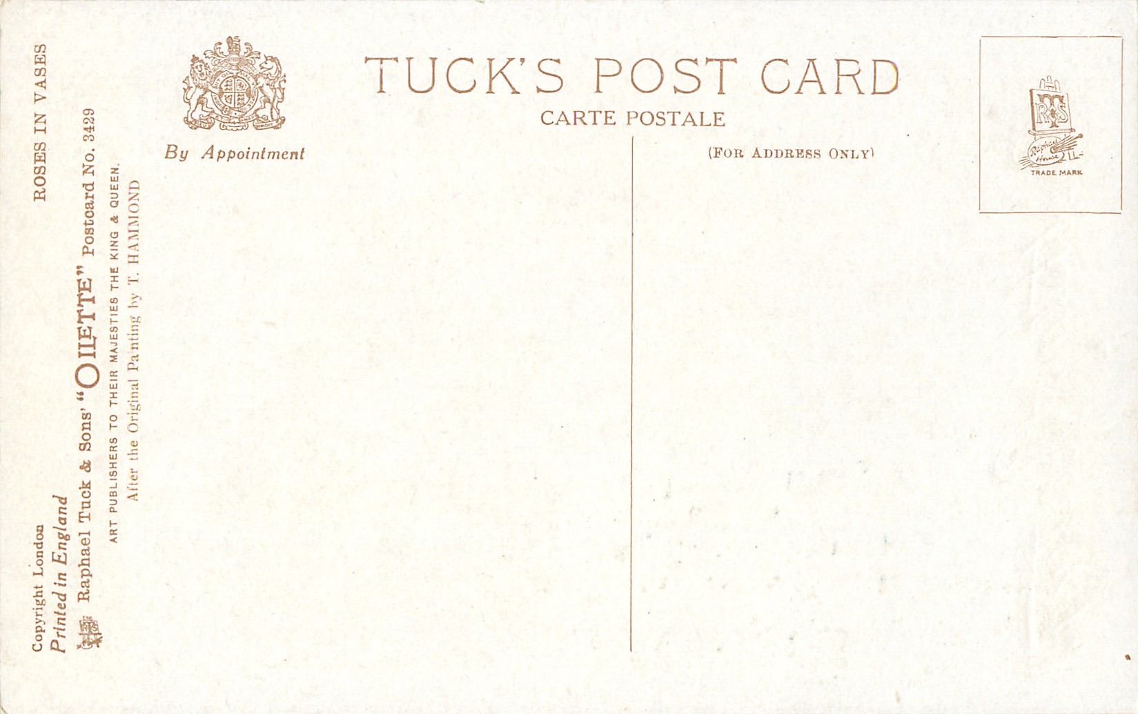 OILETTE, PRINTED IN ENGLAND, COPYRIGHT LONDON, come O/F but not so trade named, AFTER THE ORIGINAL PAINTING BY T. HAMMOND., come with various greetings