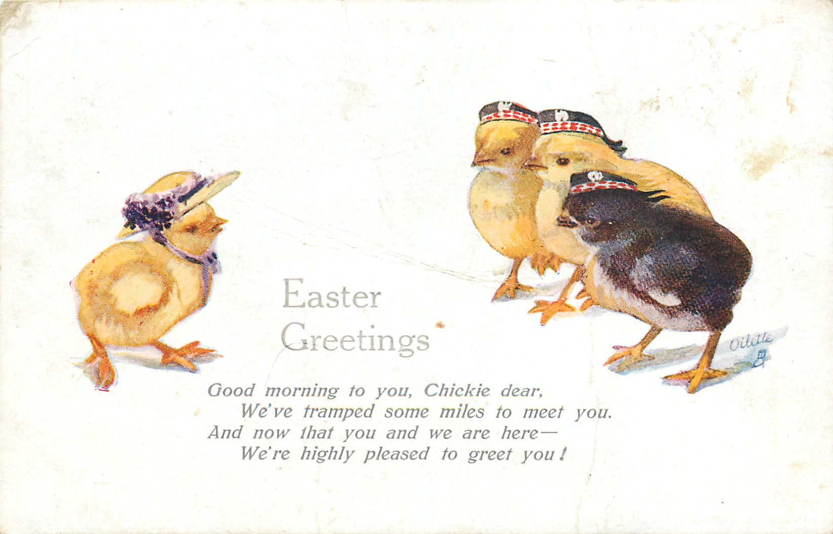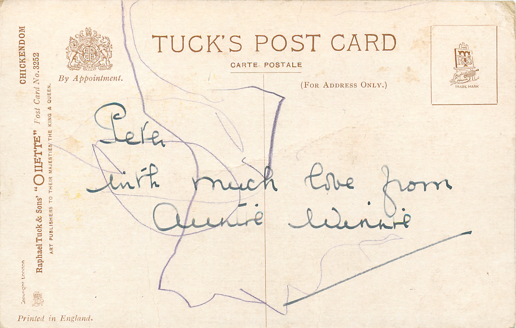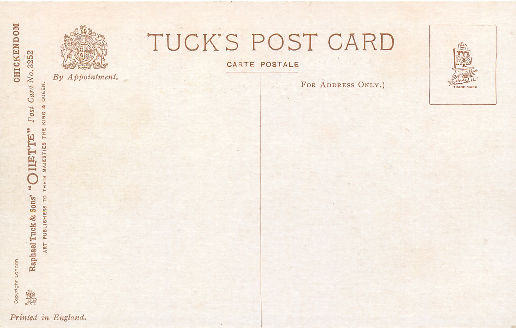 OILETTE, PRINTED IN ENGLAND, COPYRIGHT LONDON, 2 backs, also come titled IN CHICKENDOM, come with Easter greetings
