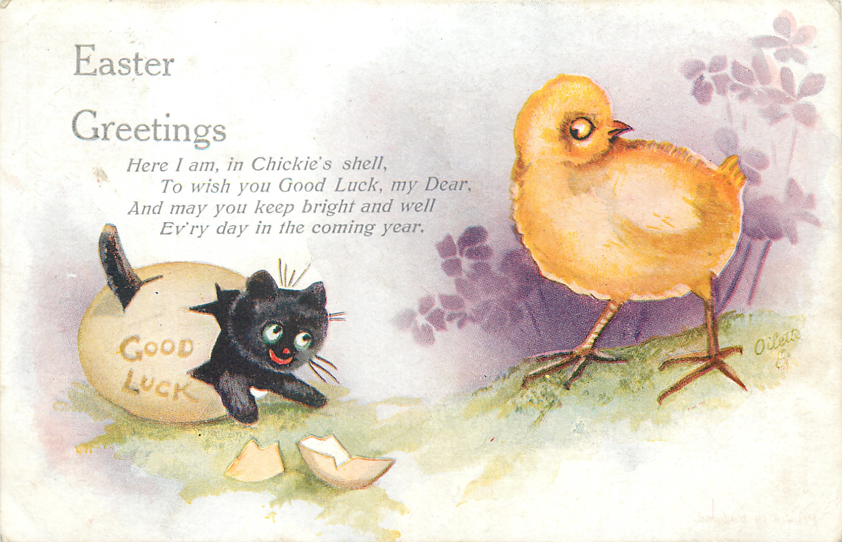 EASTER GREETINGS verse, chick looks suspiciously at kitten in egg-shell