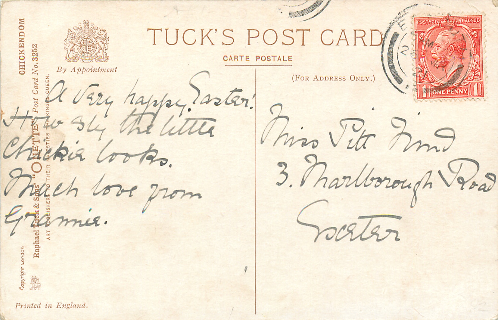 OILETTE, PRINTED IN ENGLAND, COPYRIGHT LONDON, 2 backs, also come titled IN CHICKENDOM, come with Easter greetings