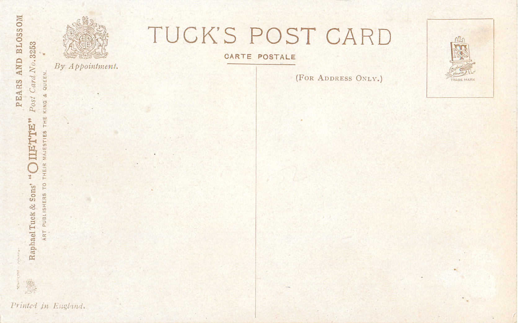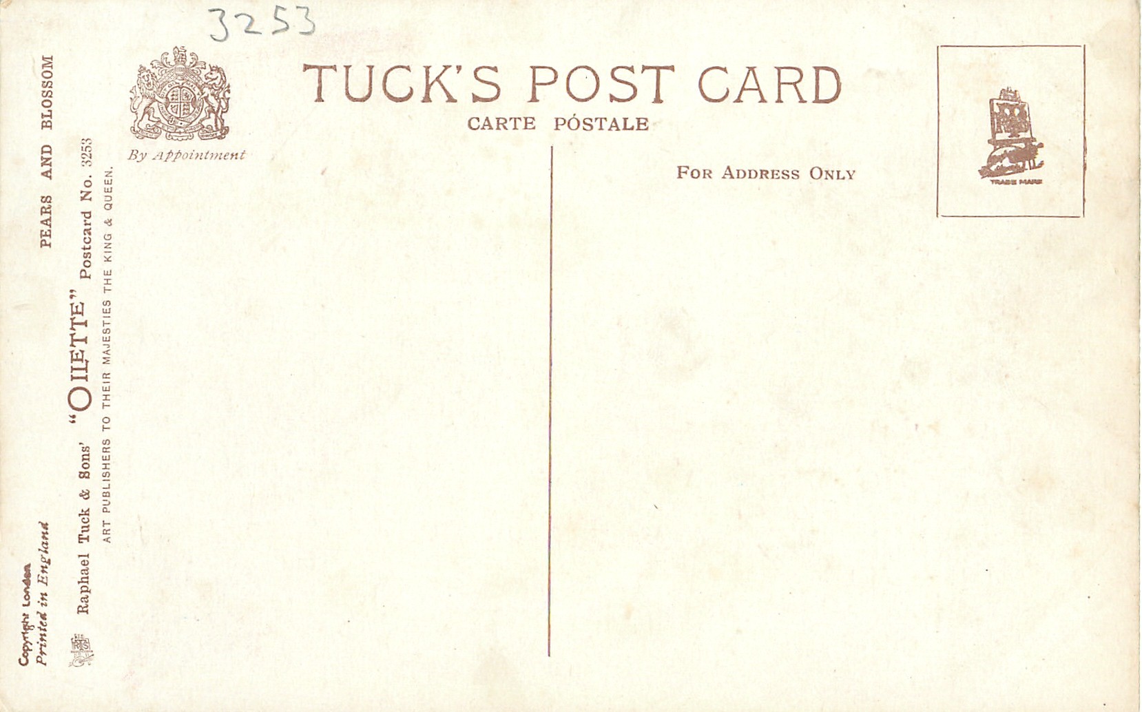 OILETTE, PRINTED IN ENGLAND, COPYRIGHT LONDON, 2 backs, listed in 1926/1927 & 1930 Postcard Catalogues
