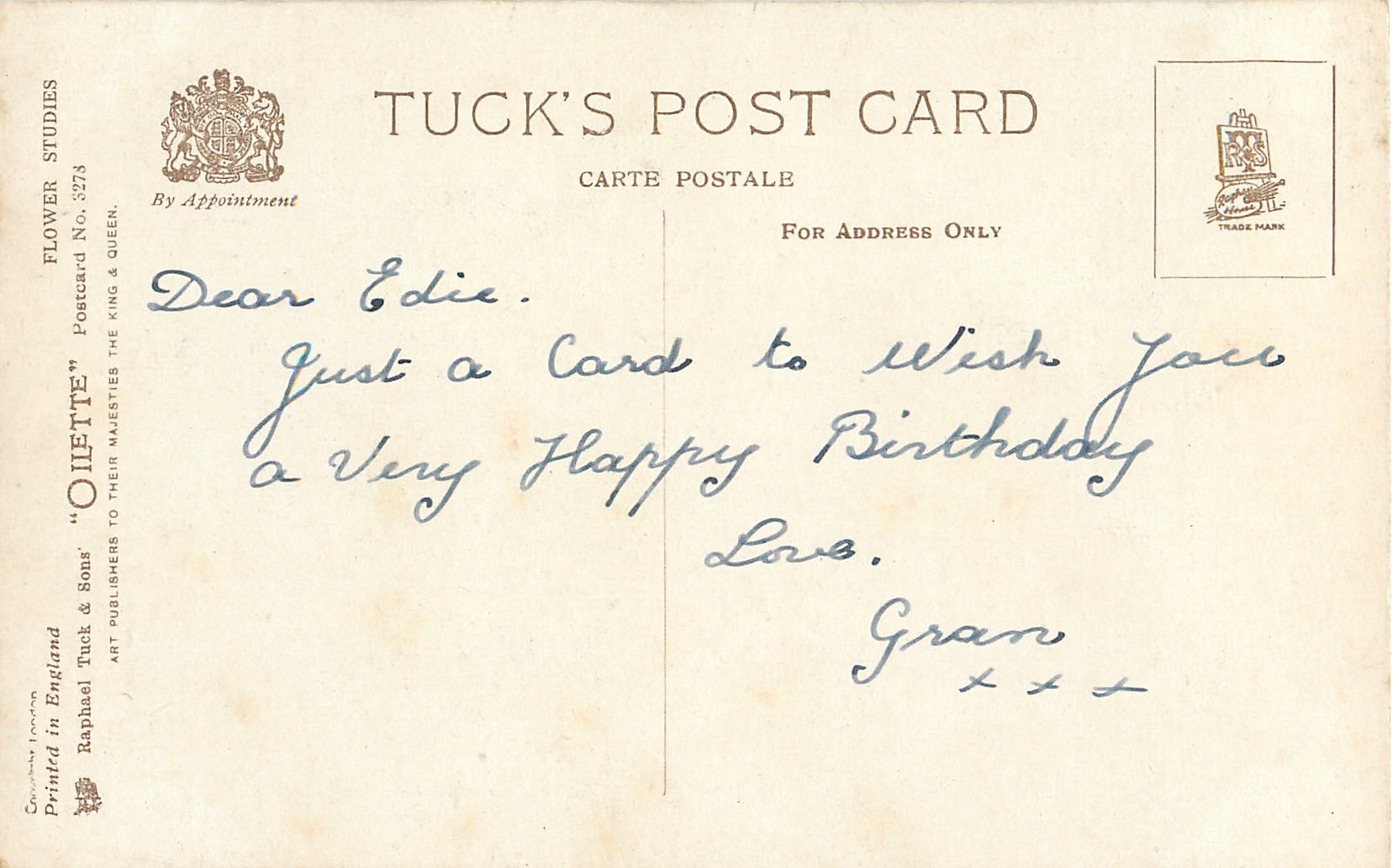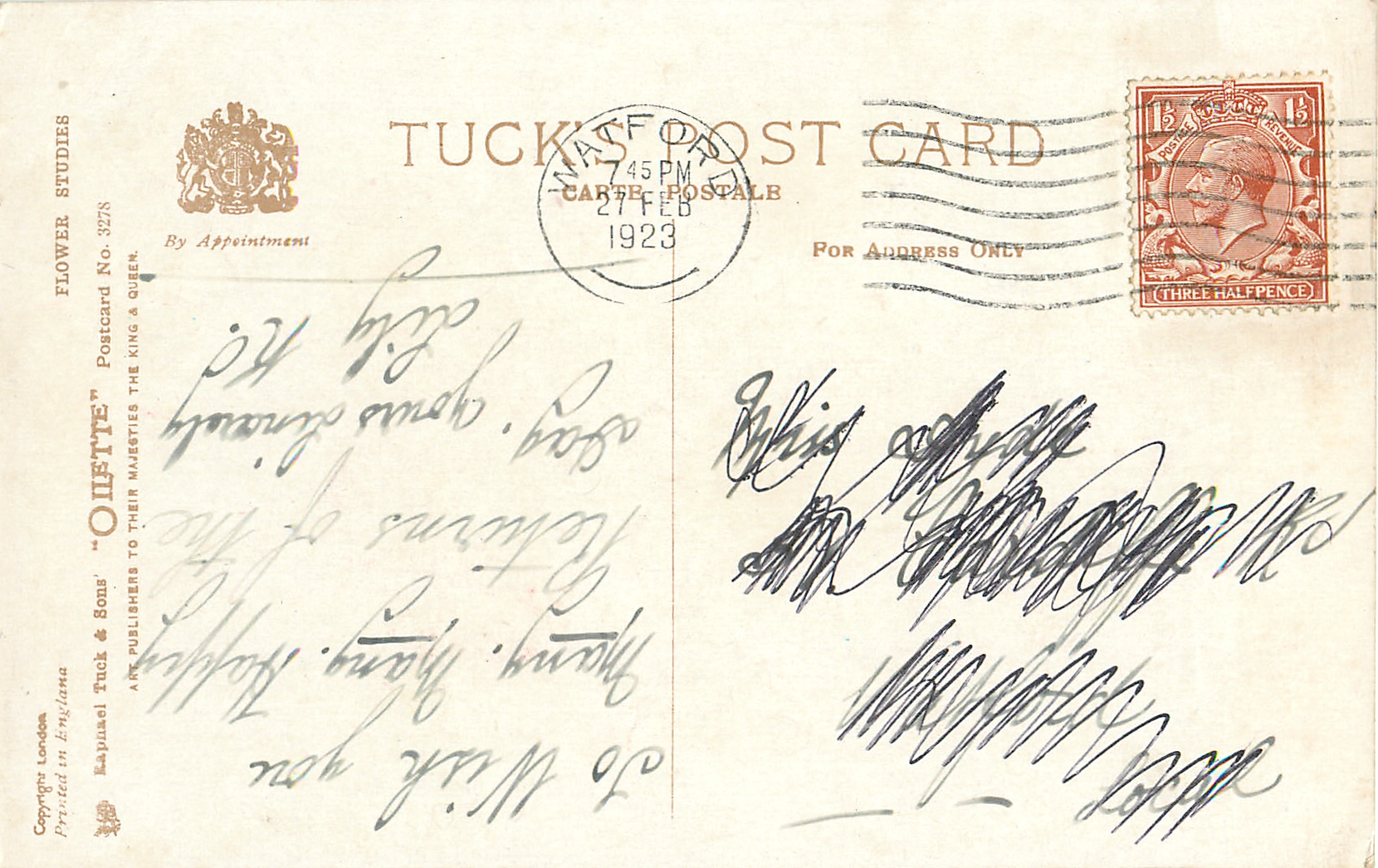 OILETTE, PRINTED IN ENGLAND, COPYRIGHT LONDON, 2 backs, come various greetings & verses, listed in 1926/1927 POSTCARD Catalogue