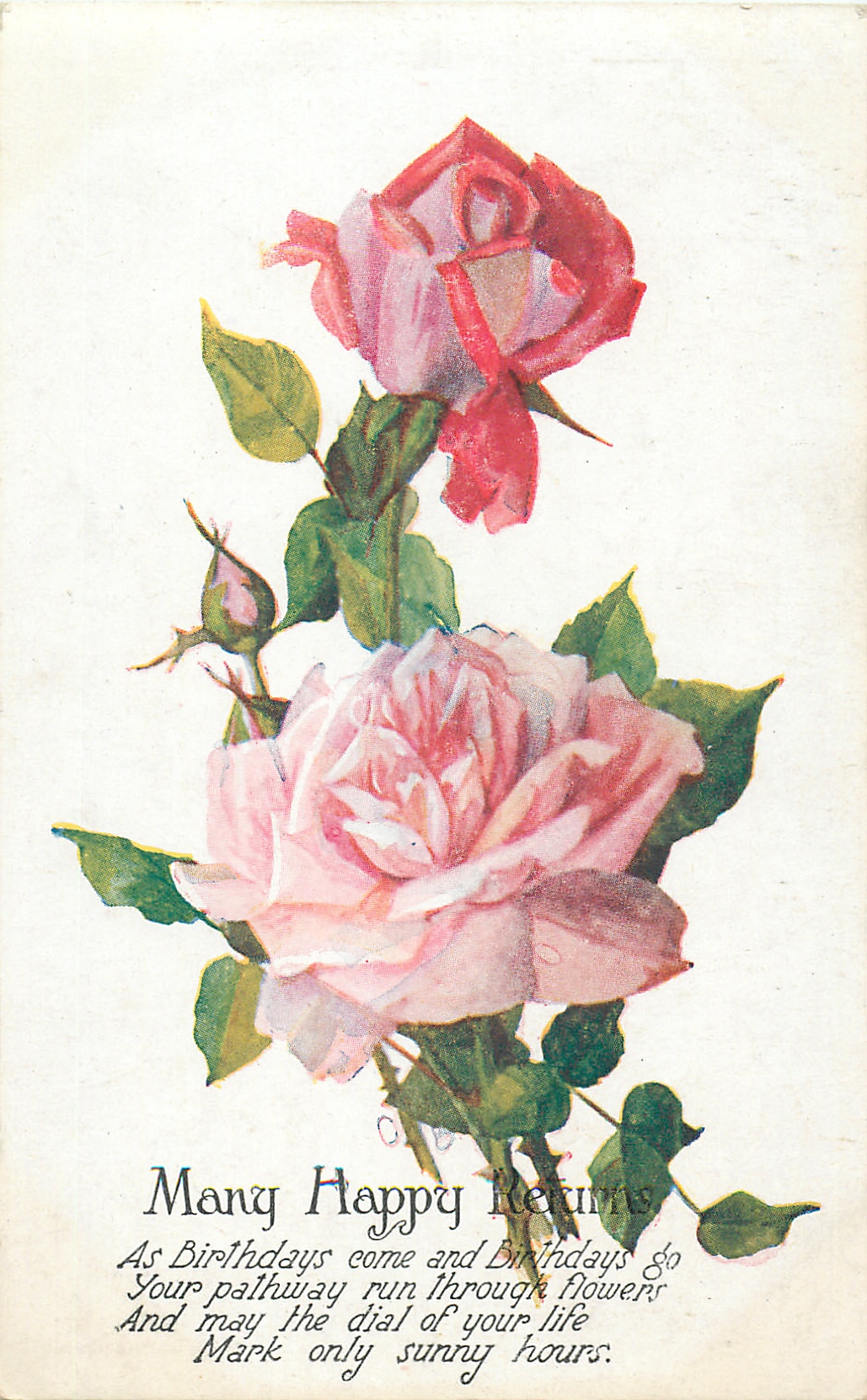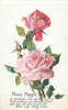 open pink rose below, smaller deeper pink rose above, buds left