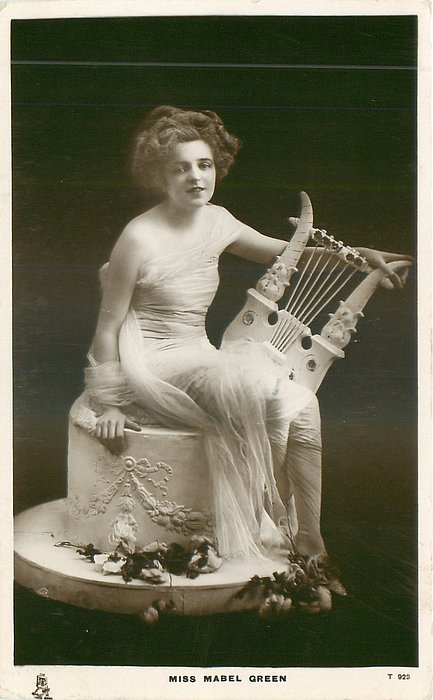 MISS MABEL GREEN posed sitting on pedestal, holding lyre