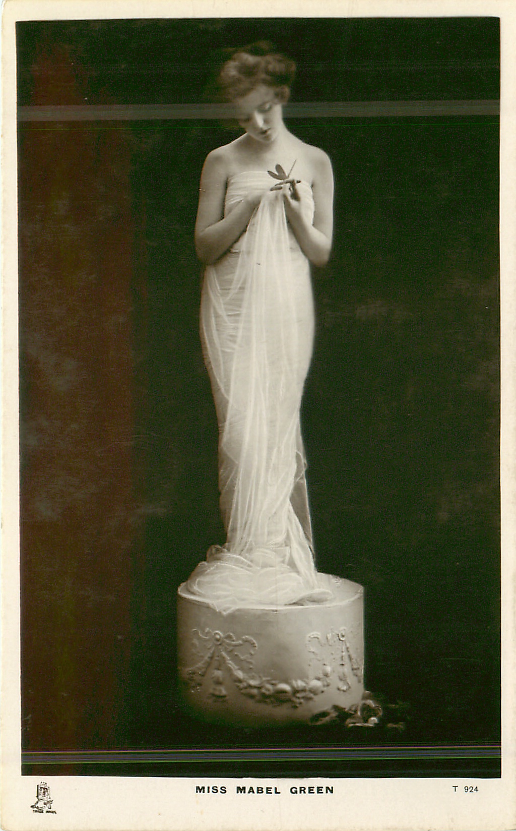 MISS MABEL GREEN posed standing on pedestal looking down at hands holding leaf & skirt