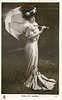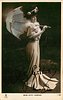 MISS KITTY GORDON with open parasol on her shoulder, facing right, looking up
