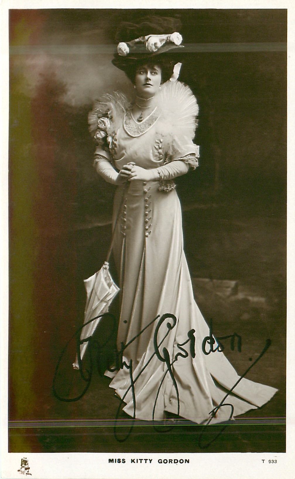 MISS KITTY GORDON closed parasol held with both hands, facing front, looking up