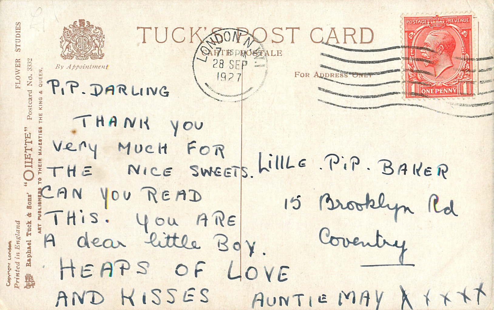 OILETTE, PRINTED IN ENGLAND, COPYRIGHT LONDON, listed in 1926/1927 POSTCARD Catalogue