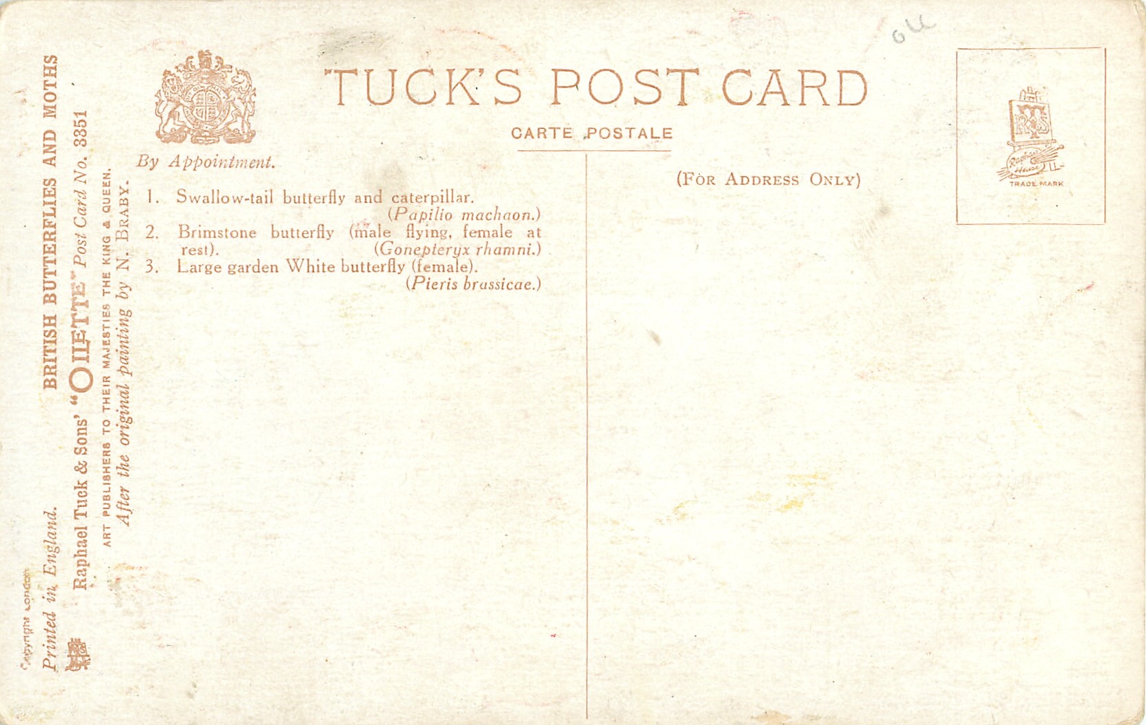 OILETTE, PRINTED IN ENGLAND, COPYRIGHT LONDON, AFTER THE ORIGINAL PAINTING BY N. BRABY. listed in 1930 POSTCARD Catalogue
