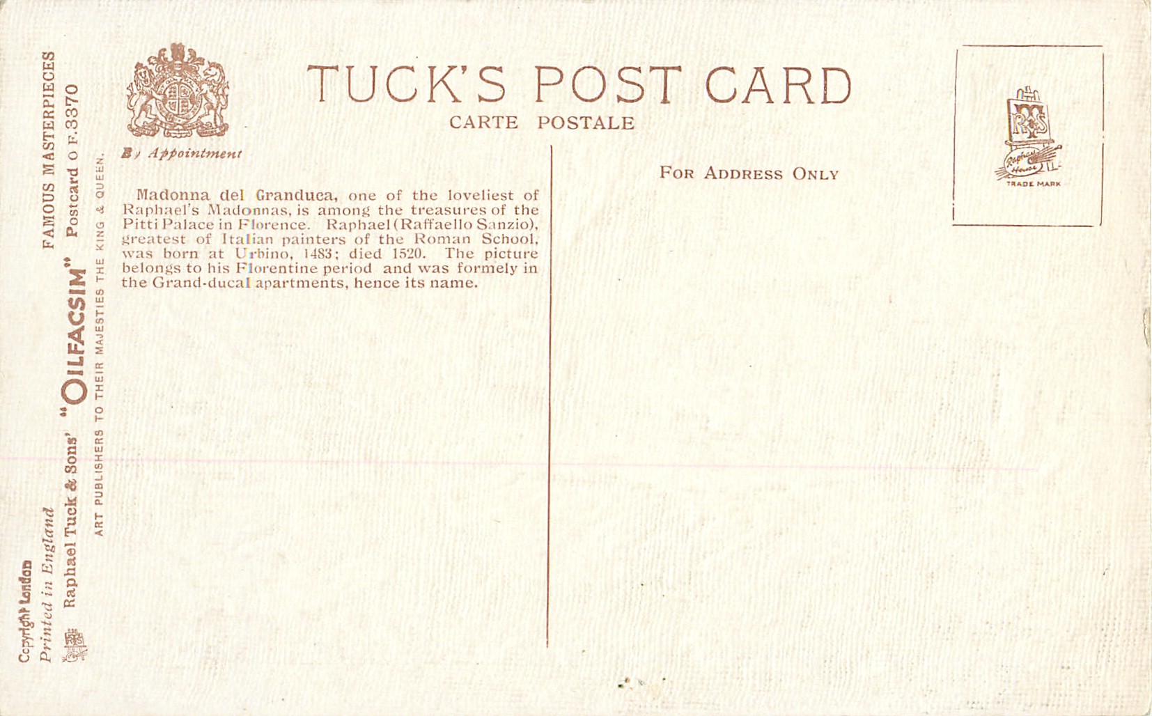 OILETTE, PRINTED IN ENGLAND, COPYRIGHT LONDON, 2 backs, come OILFACSIM with O.F. prefixes, come O/F but not so trade named, listed in 1930 POSTCARD Catalogue
