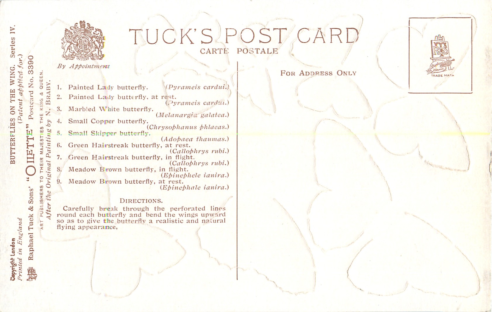 OILETTE, PRINTED IN ENGLAND, COPYRIGHT LONDON, AFTER THE ORIGINAL PAINTING BY N. BRABY.. listed in1930 POSTCARD Catalogue