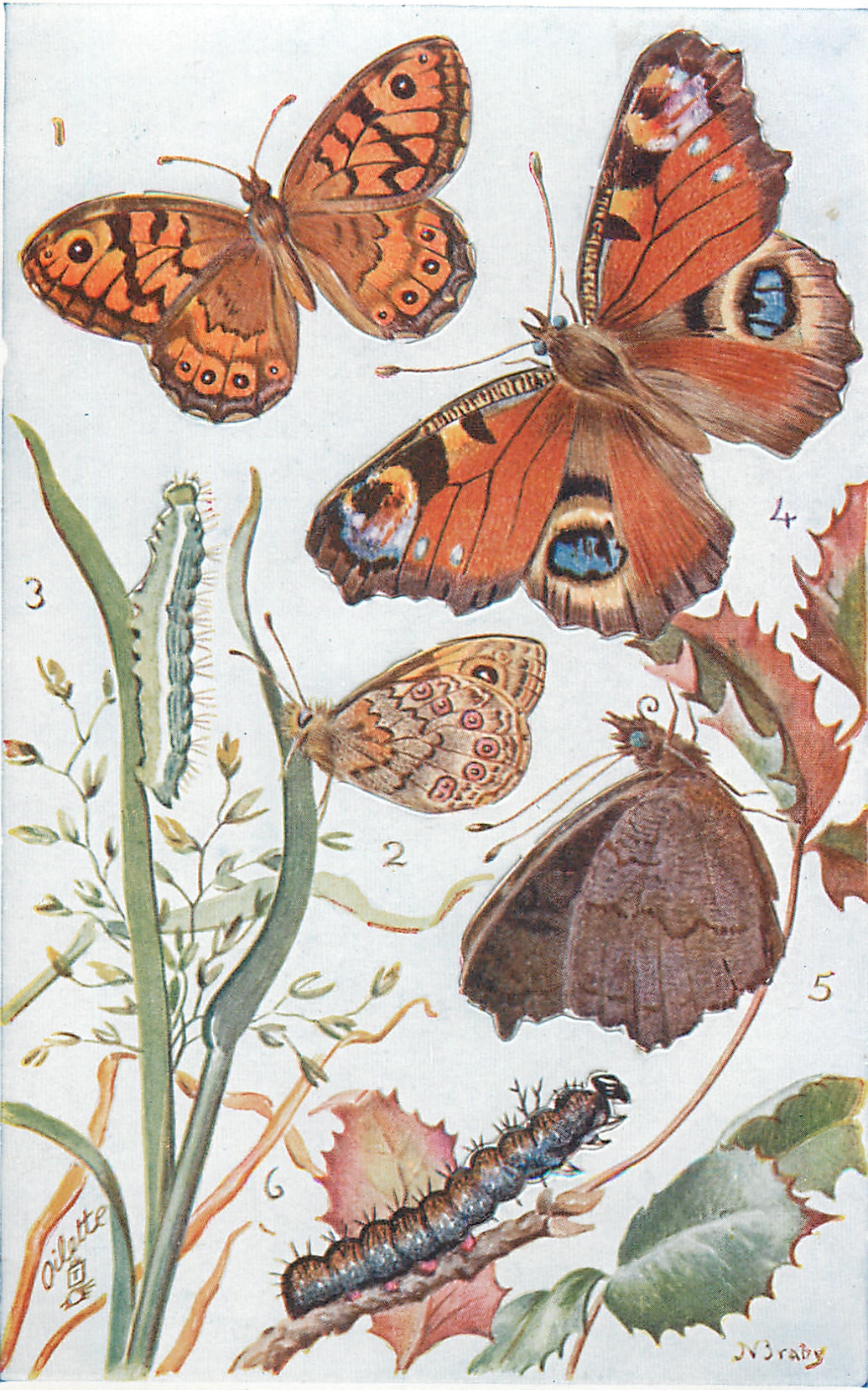 WALL BUTTERFLY IN FLIGHT (PARARGE MAGAERA)//CATERPILLAR OF PEACOCK BUTTERFLY