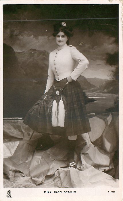 MISS JEAN AYLWIN in Scottish uniform, standing in front of painting of scenery