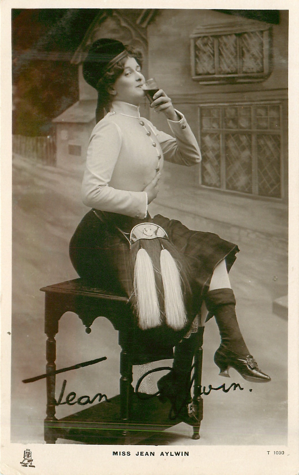 MISS JEAN AYLWIN in Scottish uniform, sitting on table drinking beer