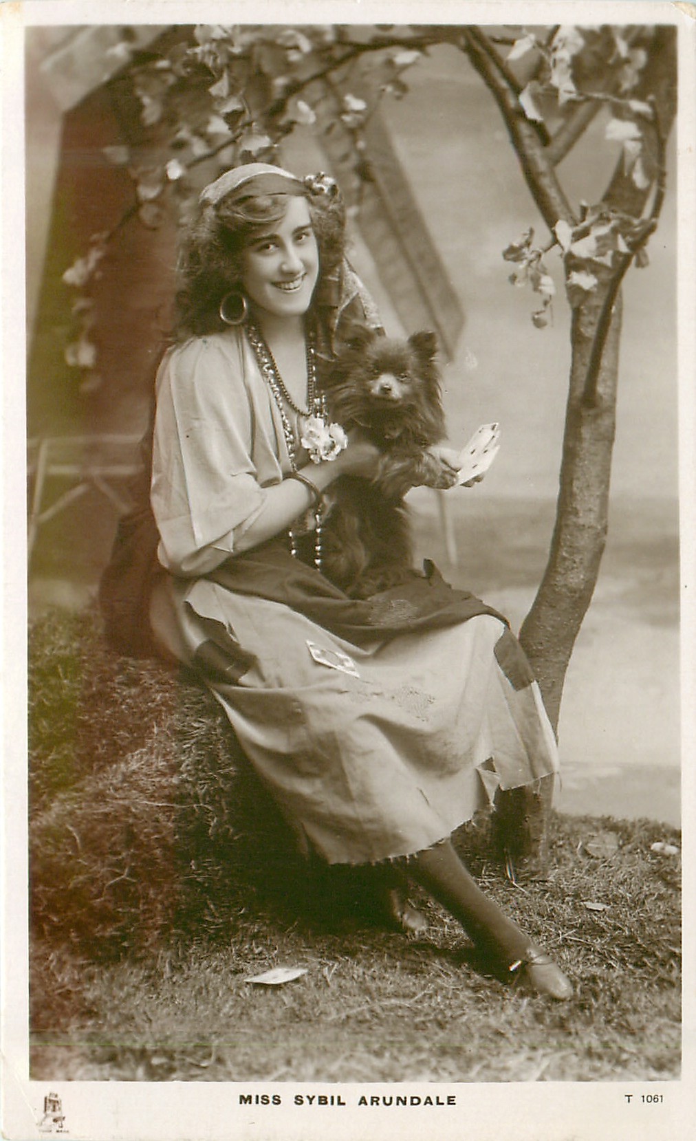 MISS SYBIL ARUNDALE as gypsy, sitting holding playing cards, with chihuahua under her arm