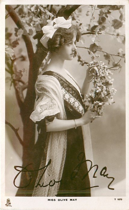 MISS OLIVE MAY stands facing right holding blossom