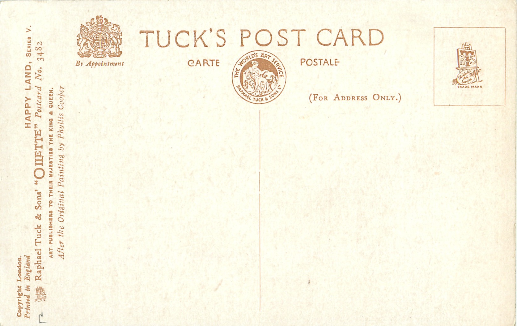 OILETTE, PRINTED IN ENGLAND, COPYRIGHT LONDON, AFTER THE ORIGINAL PAINTING BY PHYLLIS COOPER, listed in 1926/1927 & 1930 POSTCARD Catalogues