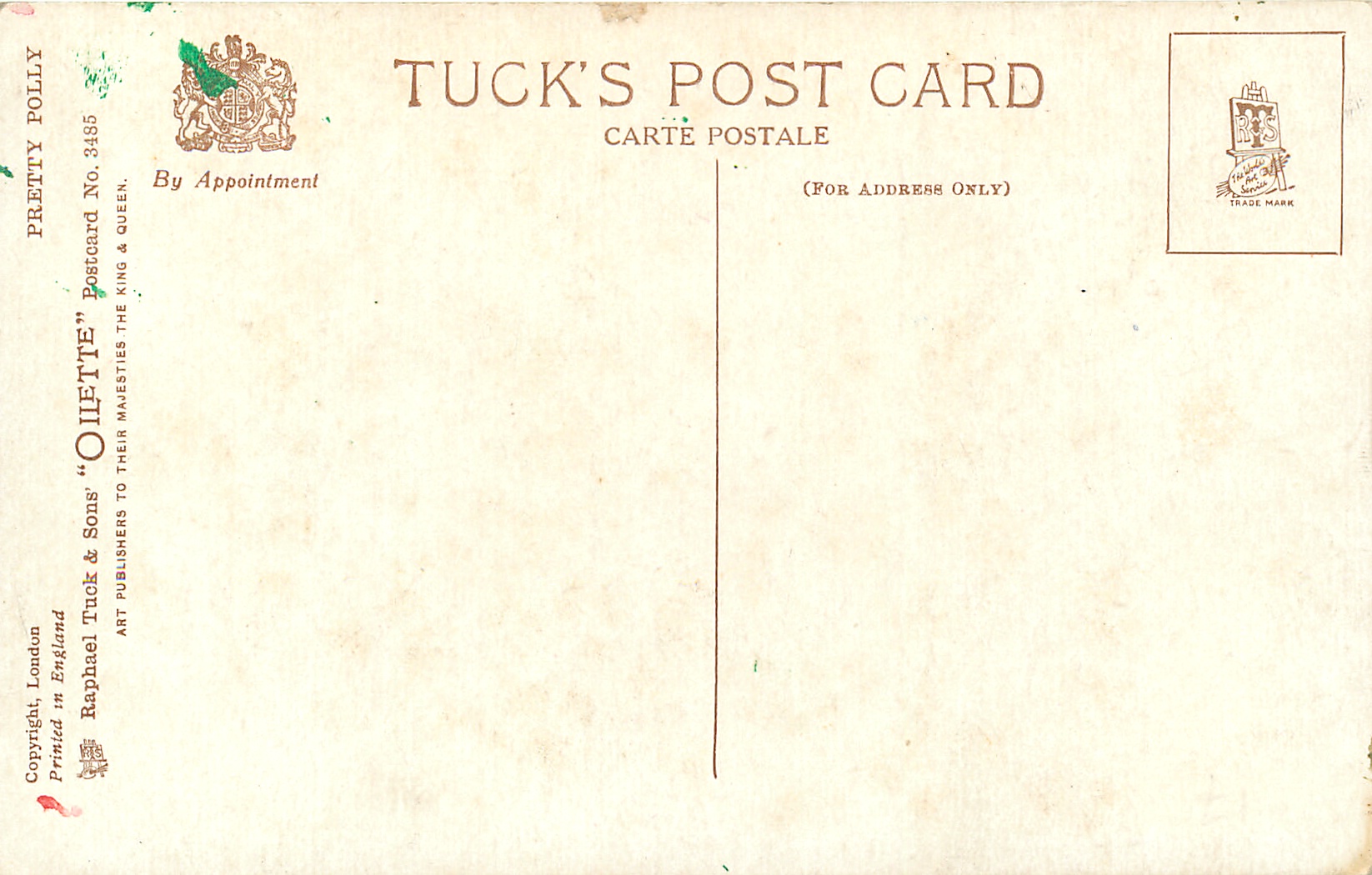 OILETTE, PRINTED IN ENGLAND, COPYRIGHT LONDON, listed in 1930 Postcard Catalogue