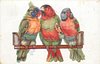 three parrots on perch, all face front