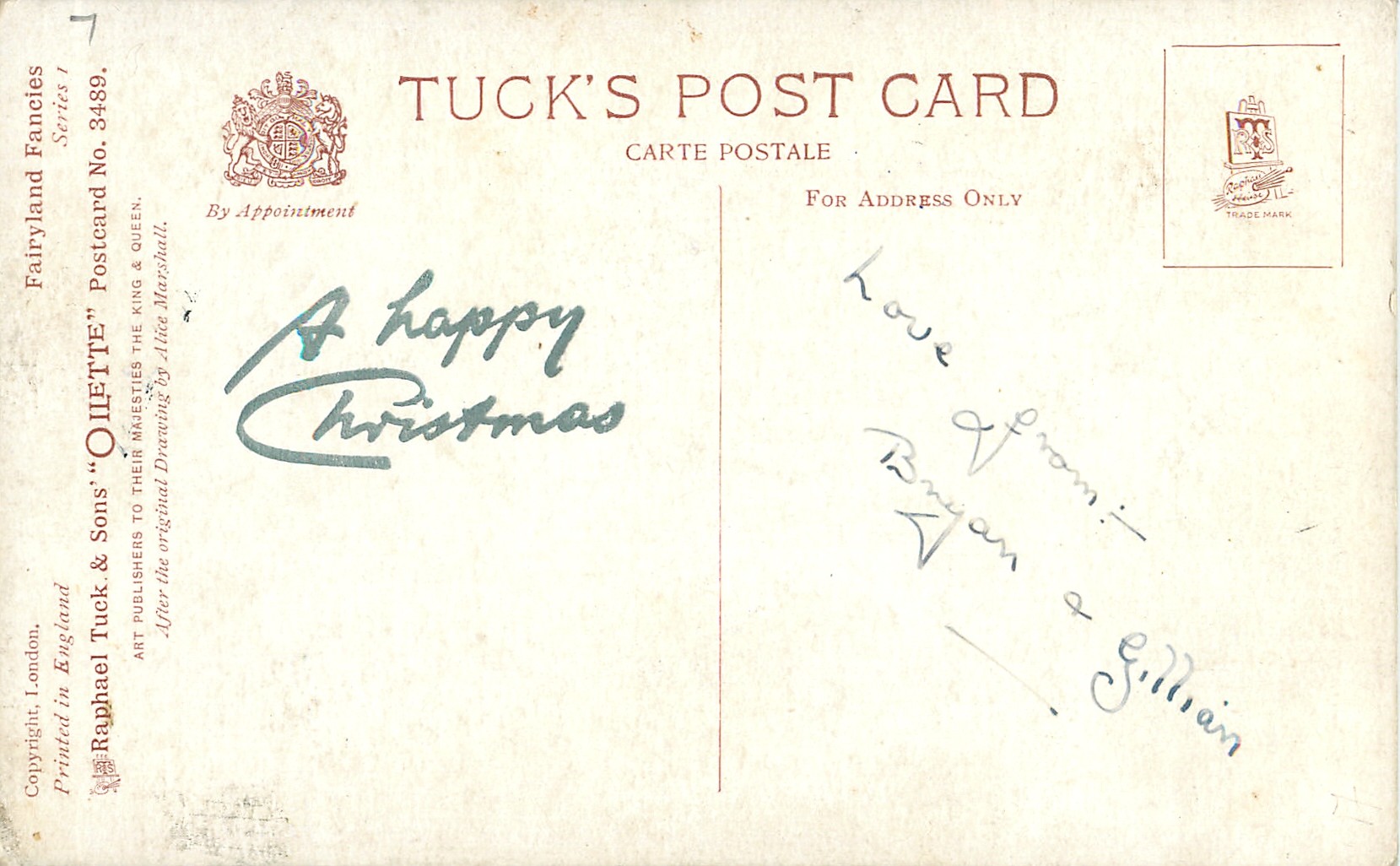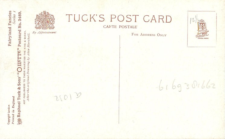 OILETTE, PRINTED IN ENGLAND, COPYRIGHT LONDON, come with greetings printed on back, AFTER THE ORIGINAL PAINTING BY ALICE MARSHALL., listed in 1926/1927 Postcard Catalogue