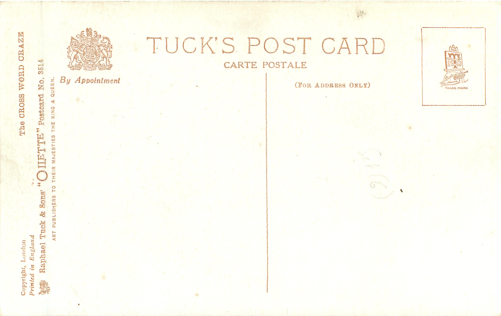 OILETTE, PRINTED IN ENGLAND, COPYRIGHT LONDON, listed in 1930 POSTCARD catalogue,