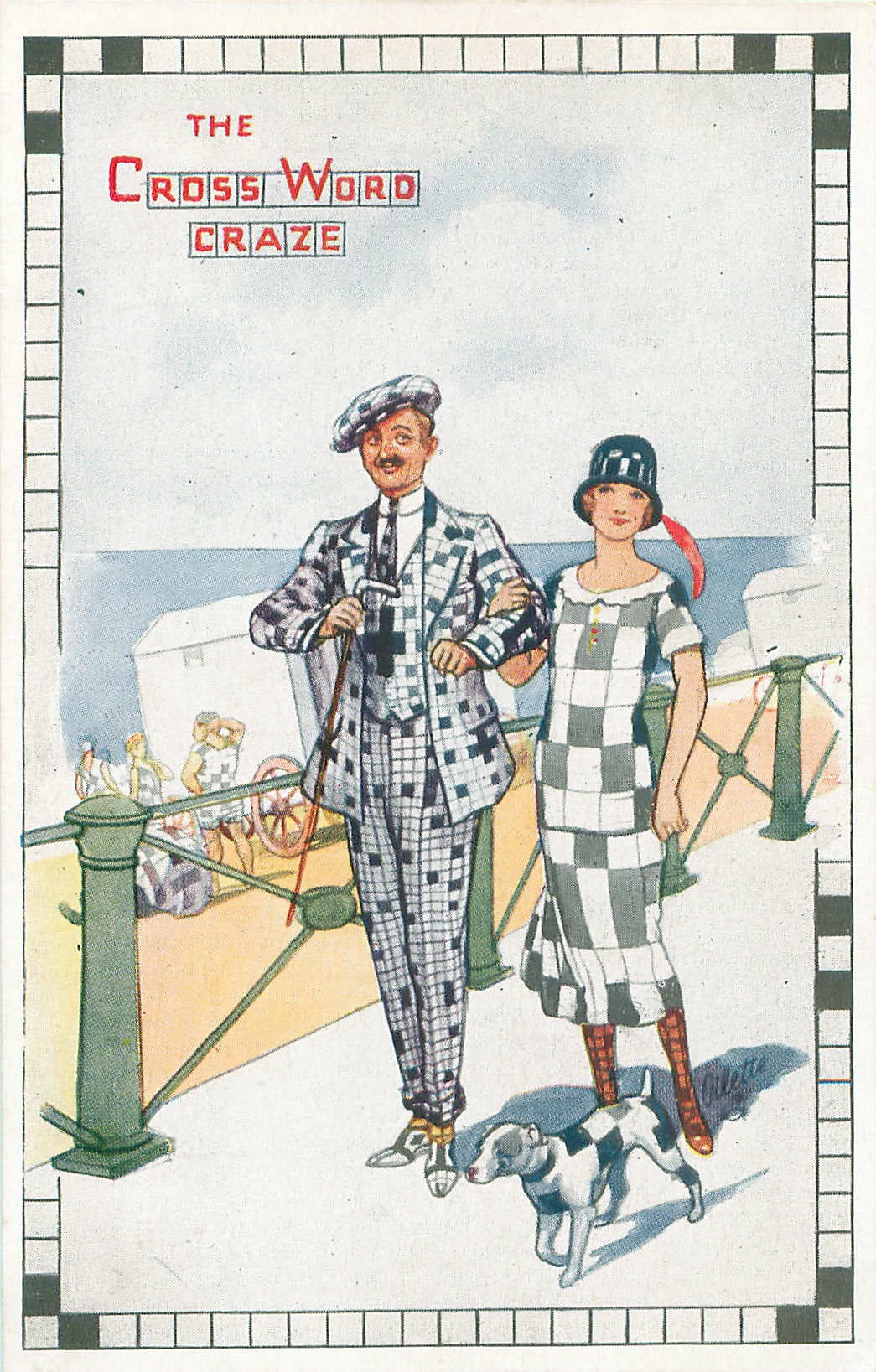 THE CROSS WORD CRAZE man woman & dog all dressed in crossword clothes