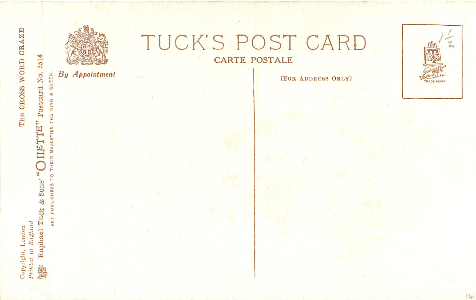 OILETTE, PRINTED IN ENGLAND, COPYRIGHT LONDON, listed in 1930 POSTCARD catalogue,