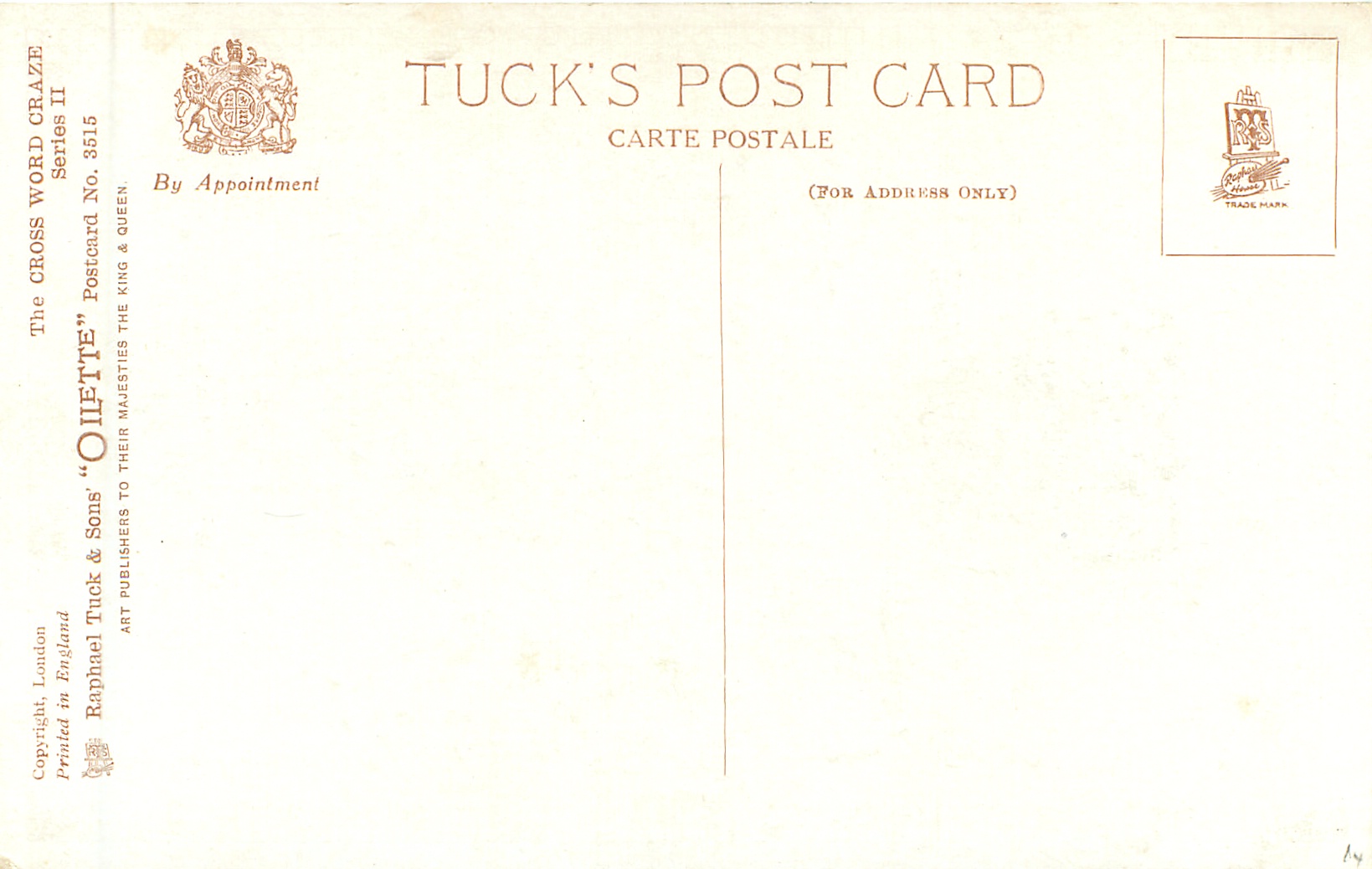 OILETTE, COPYRIGHT LONDON, PRINTED IN ENGLAND, listed in 1930 POSTCARD catalogue,