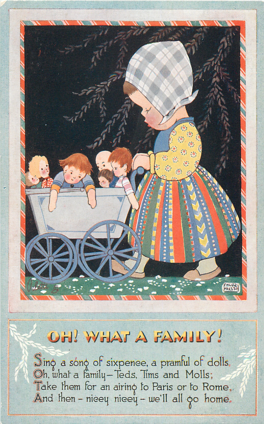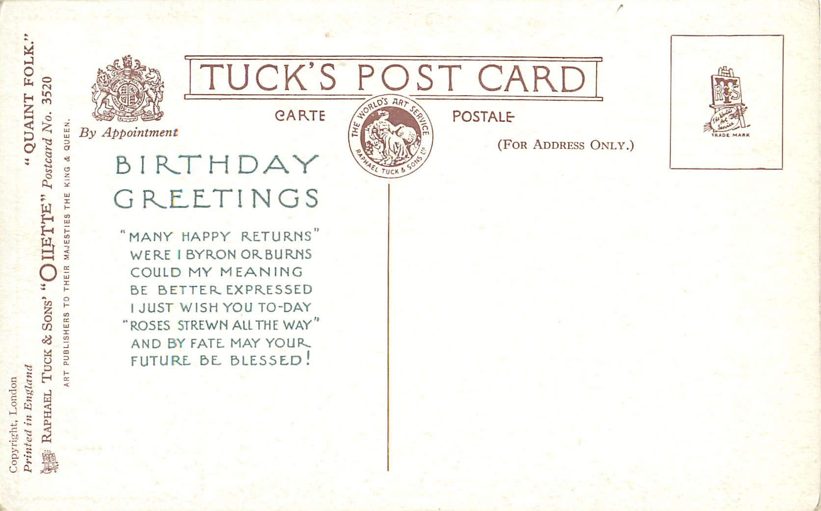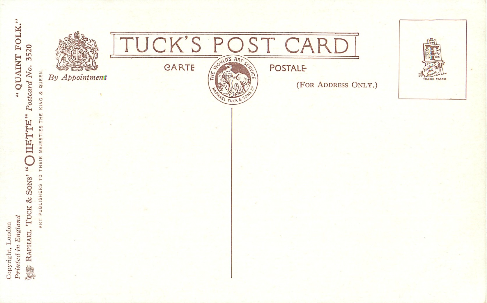 OILETTE, PRINTED IN ENGLAND, COPYRIGHT LONDON, come with greetings printed on back(unnumbered), come with greetings printed on back, come with verses, listed as QUAINT LITTLE FOLK in, 1930 POSTCARD Catalogue & 1932 ART SERVICE Catalogue