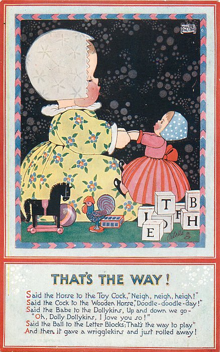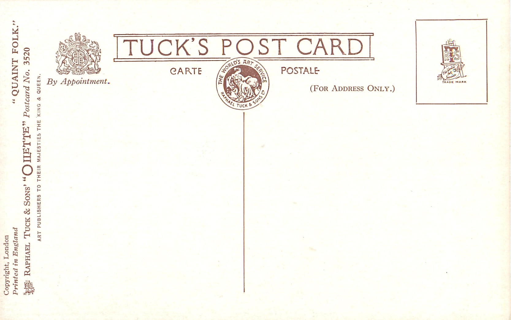OILETTE, PRINTED IN ENGLAND, COPYRIGHT LONDON, come with greetings printed on back(unnumbered), come with greetings printed on back, come with verses, listed as QUAINT LITTLE FOLK in, 1930 POSTCARD Catalogue & 1932 ART SERVICE Catalogue