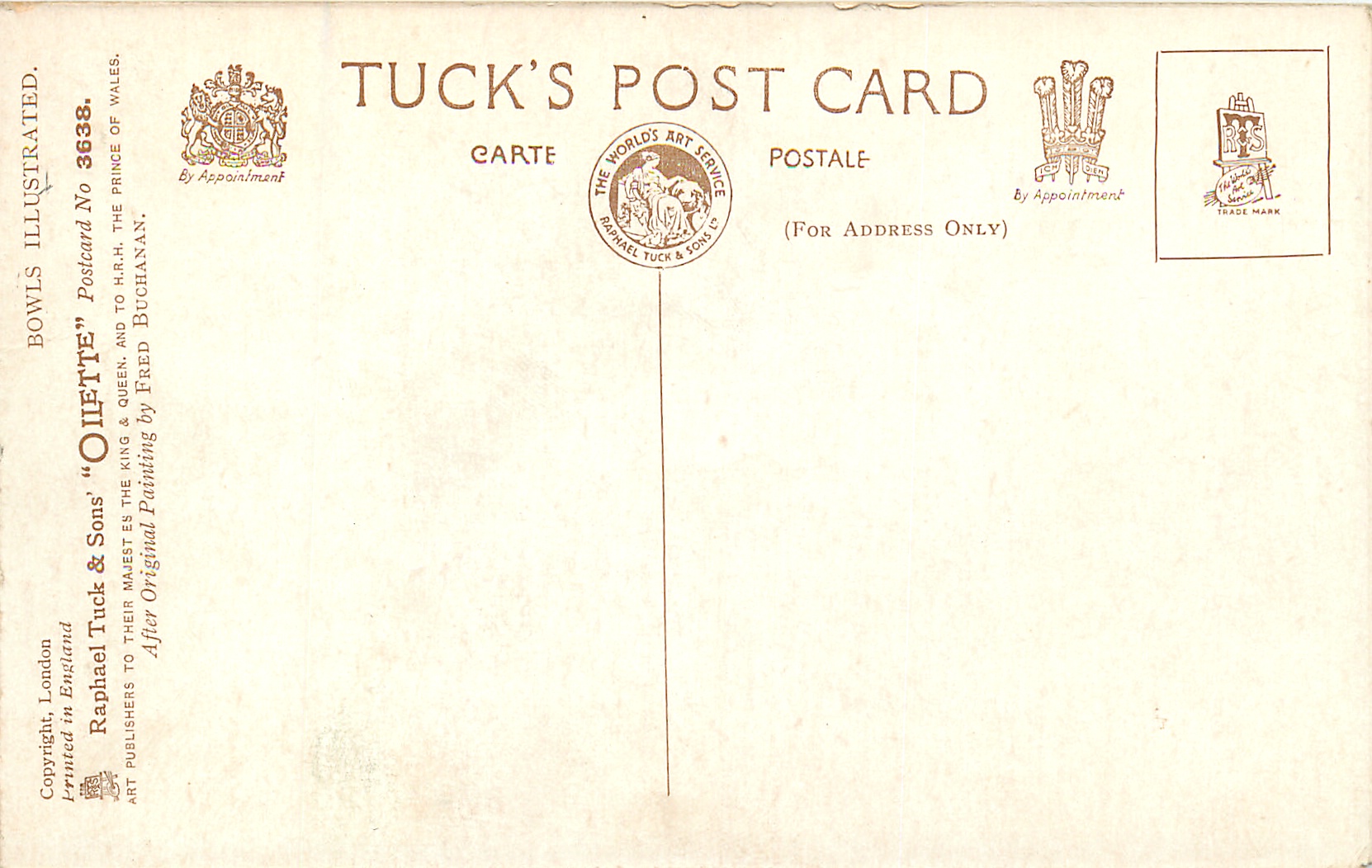 OILETTE, PRINTED IN ENGLAND, COPYRIGHT LONDON, BOWLS ILLUSTRATED on front, 2 backs, AFTER ORIGINAL PAINTING BY FRED BUCHANAN, listed in 1930 POSTCARD Catalogue