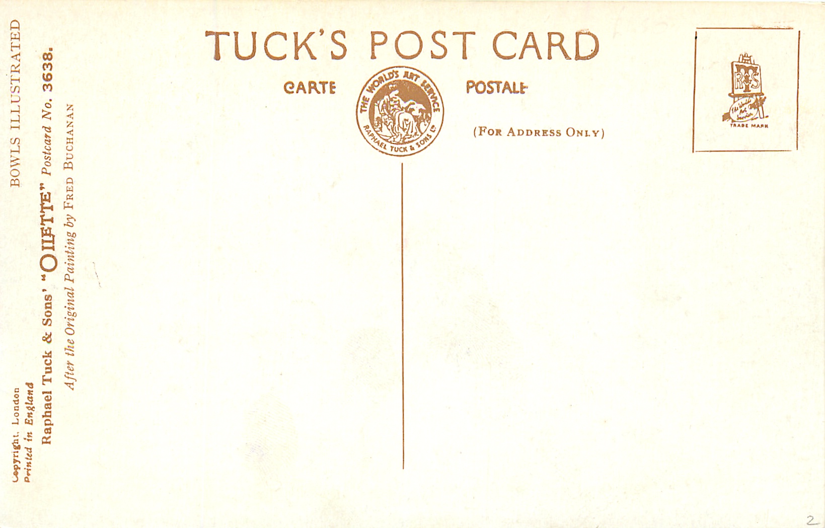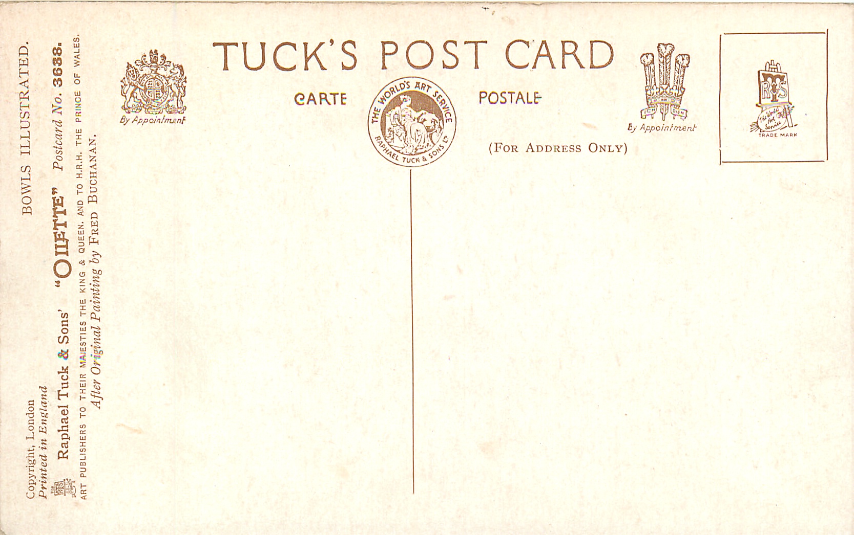OILETTE, PRINTED IN ENGLAND, COPYRIGHT LONDON, BOWLS ILLUSTRATED on front, 2 backs, AFTER ORIGINAL PAINTING BY FRED BUCHANAN, listed in 1930 POSTCARD Catalogue