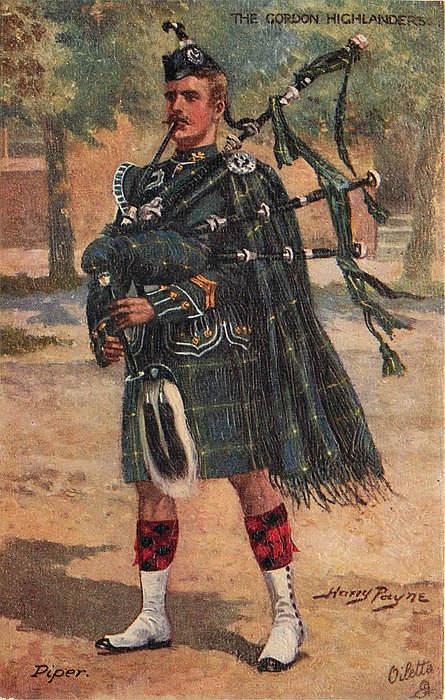 THE GORDON HIGHLANDERS PIPER piper in green plays with trees in background
