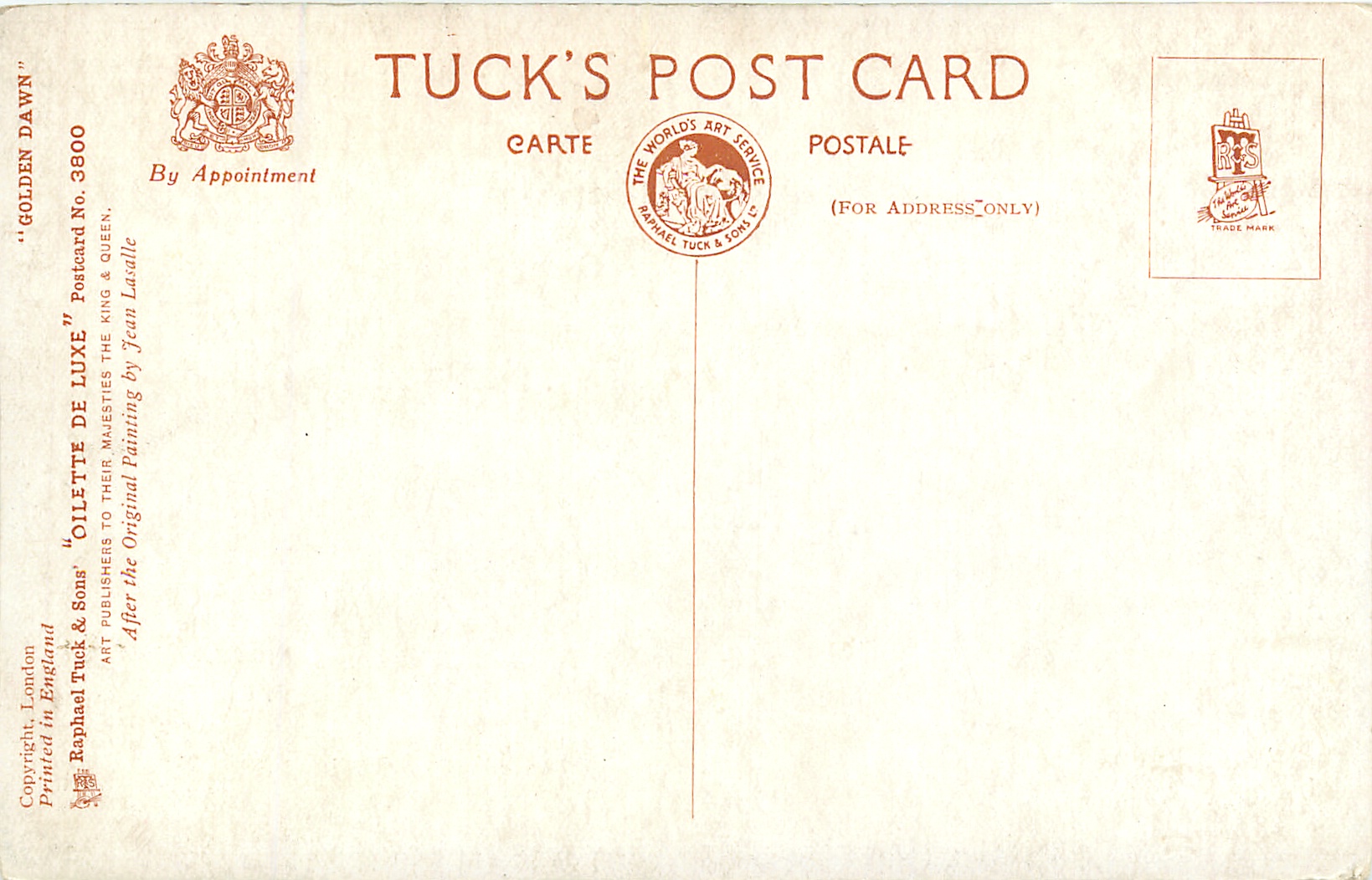 OILETTE DE LUXE, PRINTED IN ENGLAND, COPYRIGHT LONDON, comes O.F. in OILFACSIM packet but not so trade named, comes in larger sized cards with thin white edge, comes gold beveled, 2 backs, listed in 1930 POSTCARD catalogue & 1932 ART SERVICE Catalogue