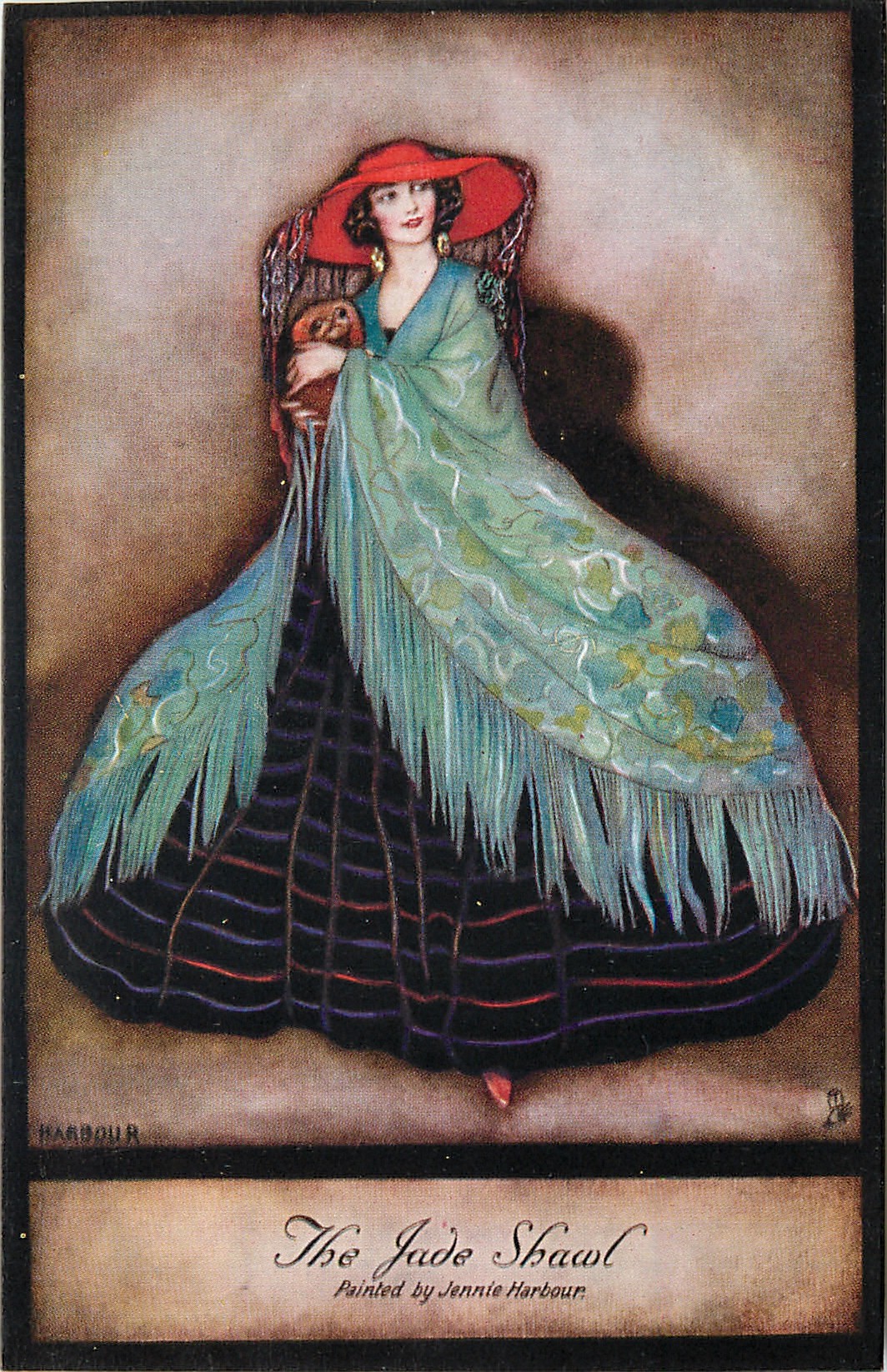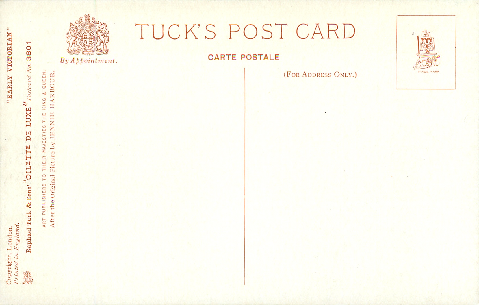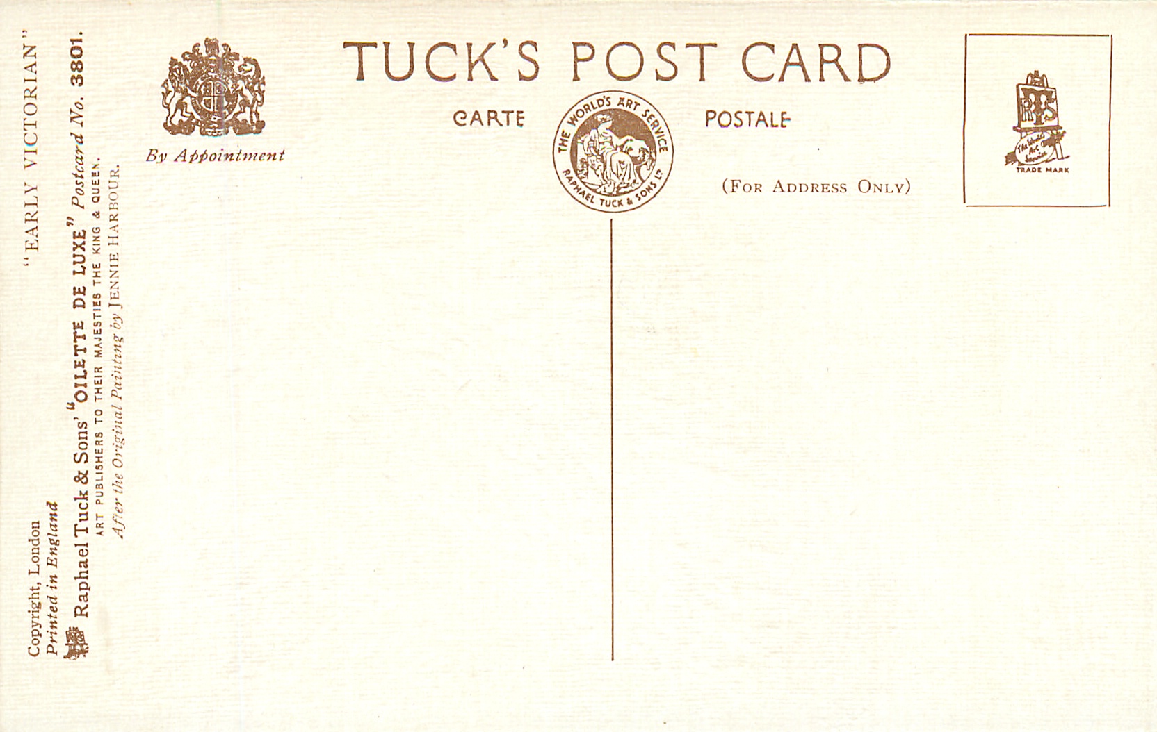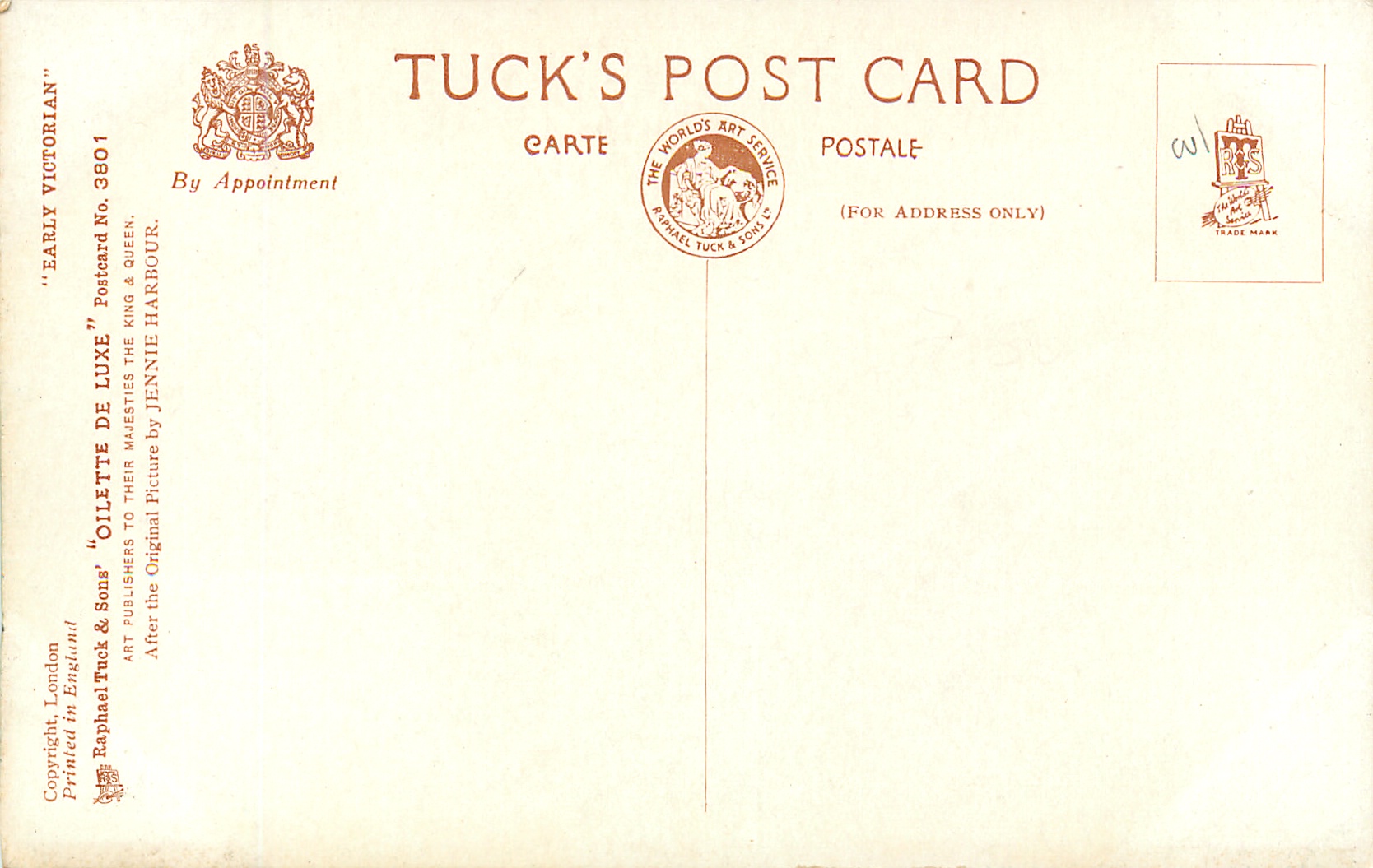 OILETTE DE LUXE, PRINTED IN ENGLAND, COPYRIGHT LONDON, packet 2 types, seen with individual card numbers, comes oilfacsim but not so trade named, comes gold bevelled, 4 backs, listed in 1930 POSTCARD Catalogue 1932 ART SERVICE Catalogue, come with THE JENNIE HARBOUR SERIES title