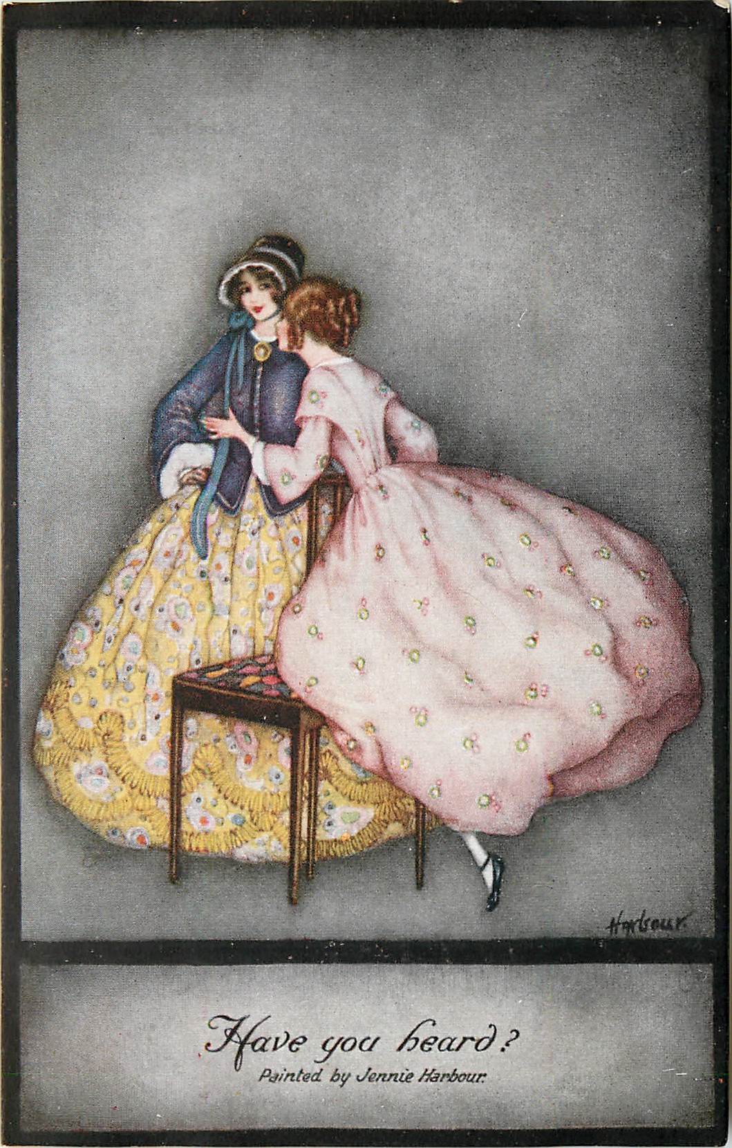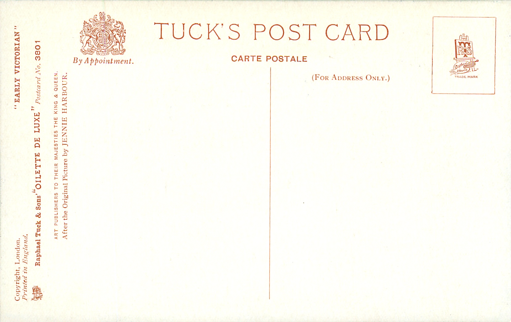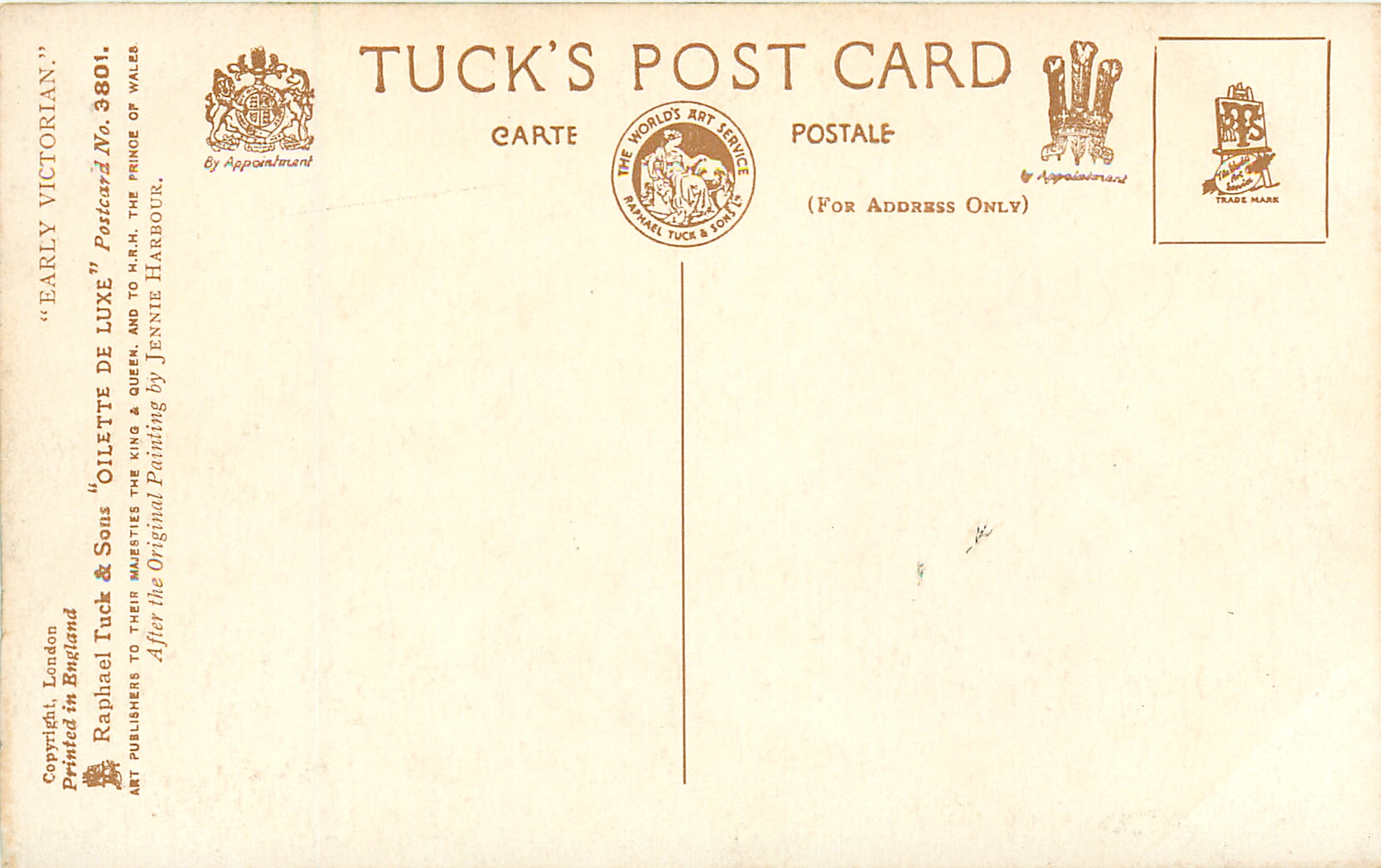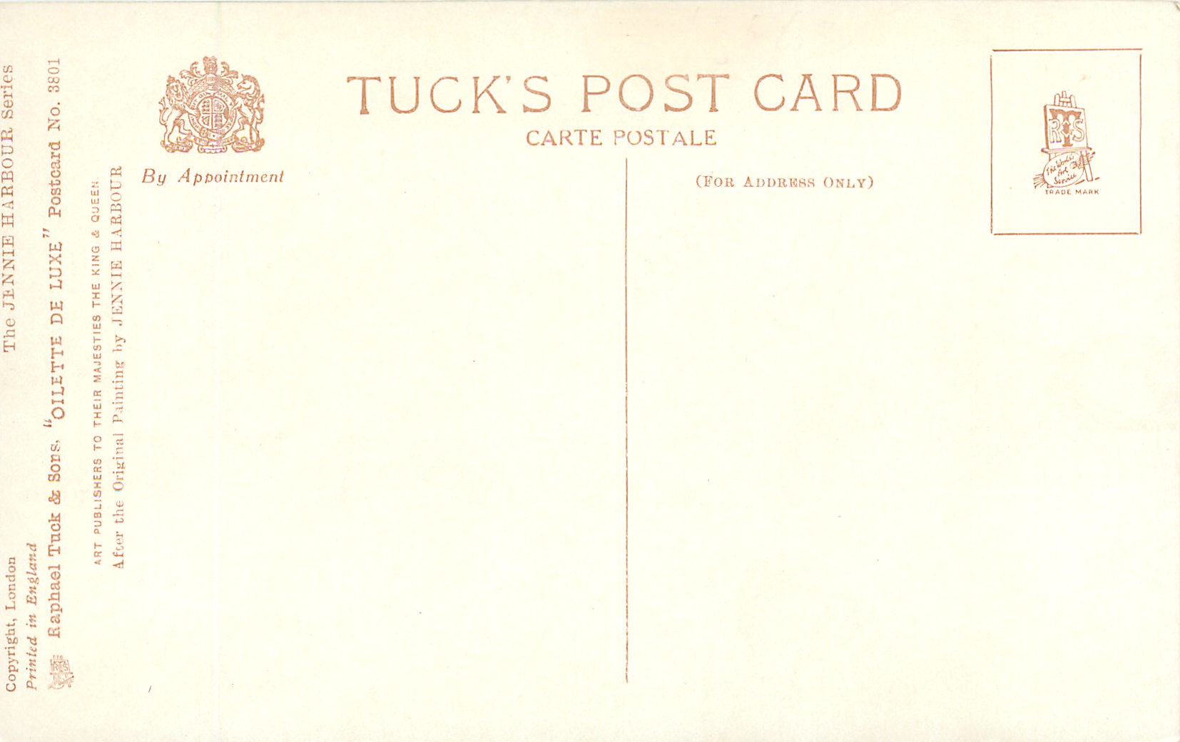 OILETTE DE LUXE, PRINTED IN ENGLAND, COPYRIGHT LONDON, packet 2 types, seen with individual card numbers, comes oilfacsim but not so trade named, comes gold bevelled, 4 backs, listed in 1930 POSTCARD Catalogue 1932 ART SERVICE Catalogue, come with THE JENNIE HARBOUR SERIES title