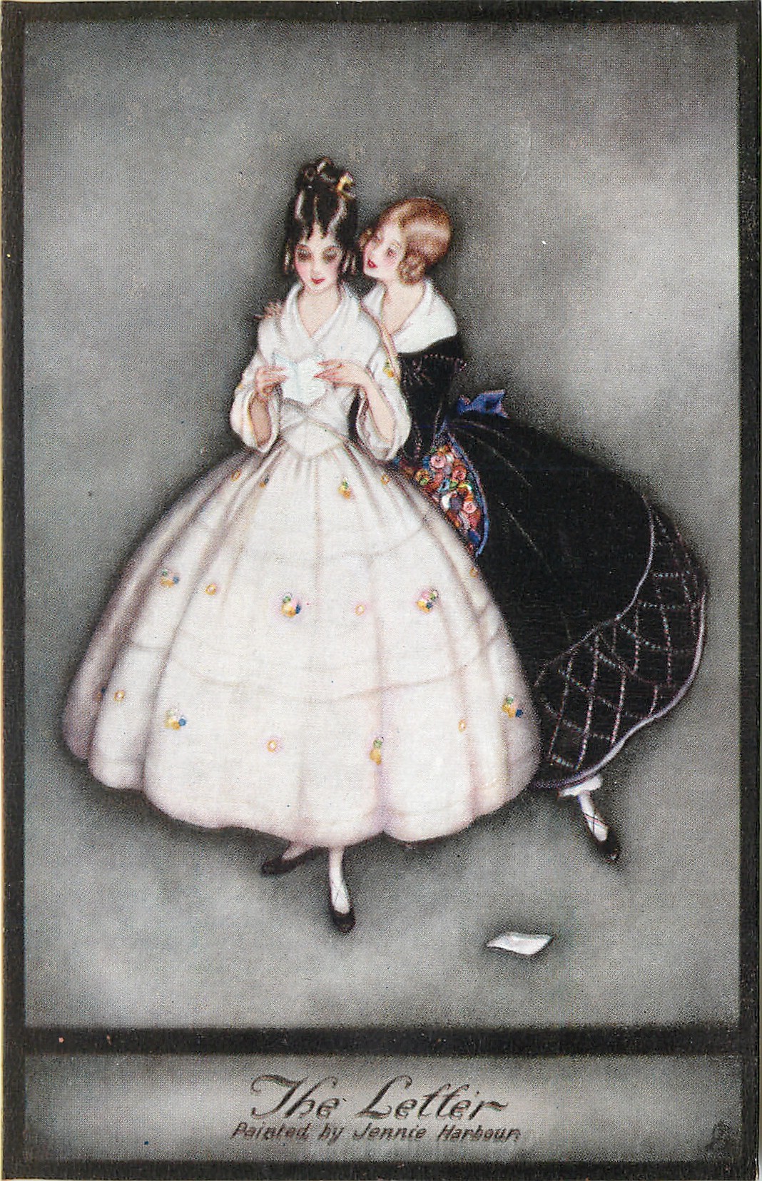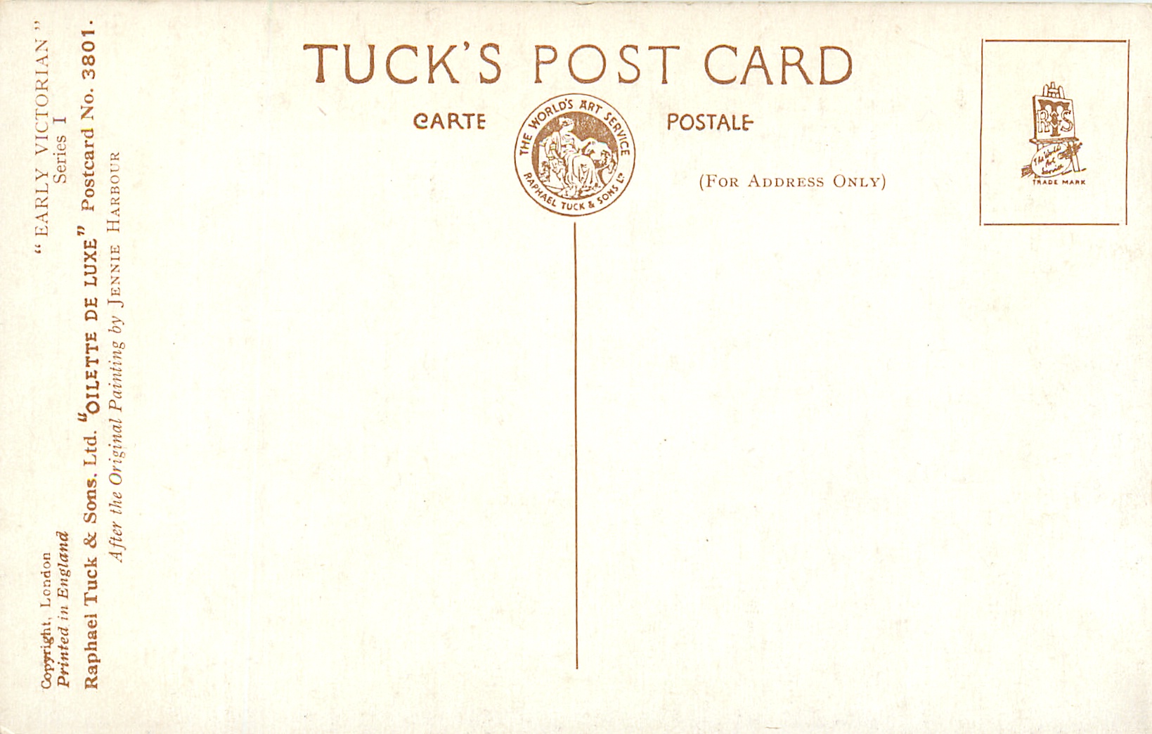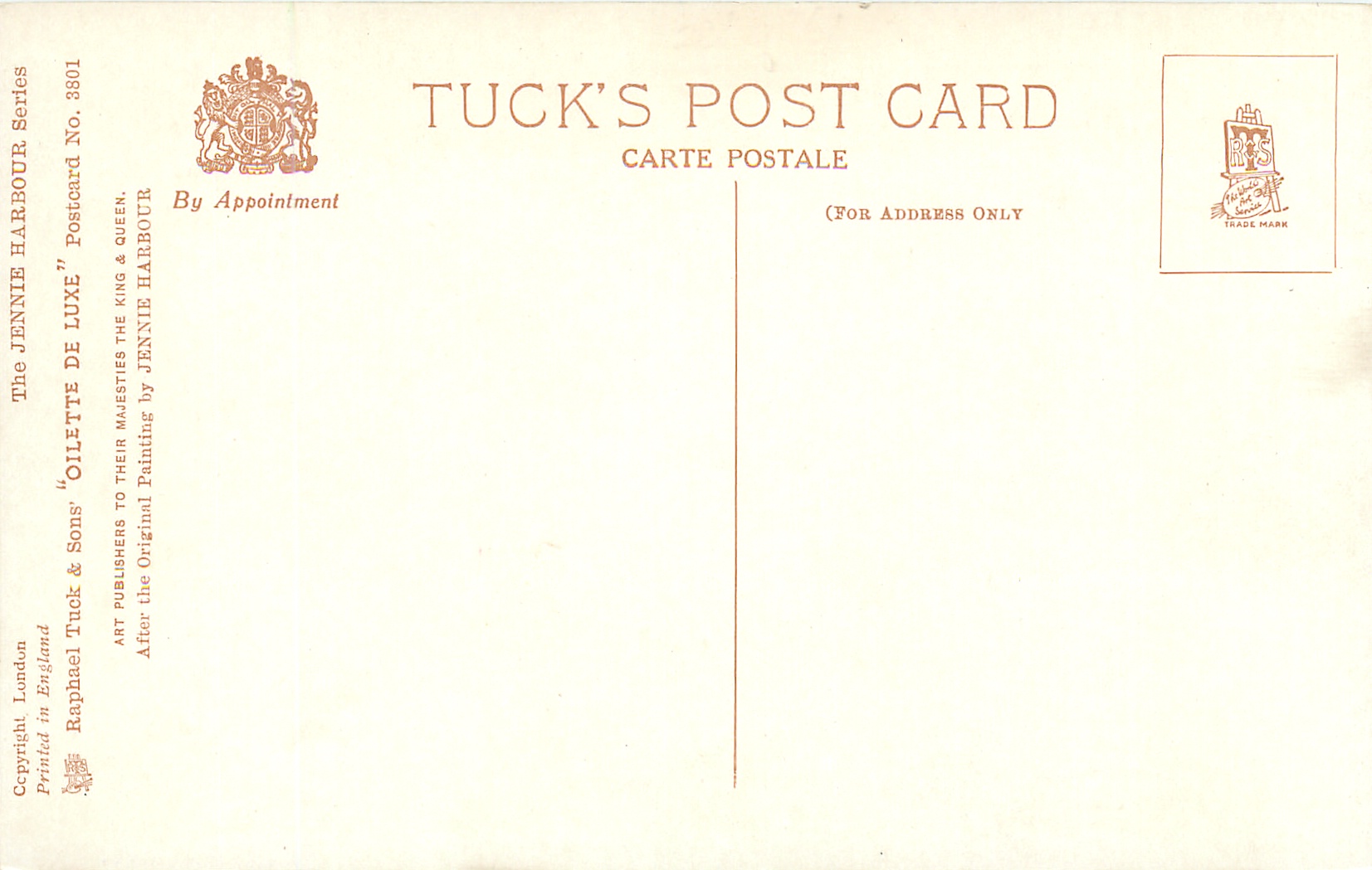 OILETTE DE LUXE, PRINTED IN ENGLAND, COPYRIGHT LONDON, packet 2 types, seen with individual card numbers, comes oilfacsim but not so trade named, comes gold bevelled, 4 backs, listed in 1930 POSTCARD Catalogue 1932 ART SERVICE Catalogue, come with THE JENNIE HARBOUR SERIES title