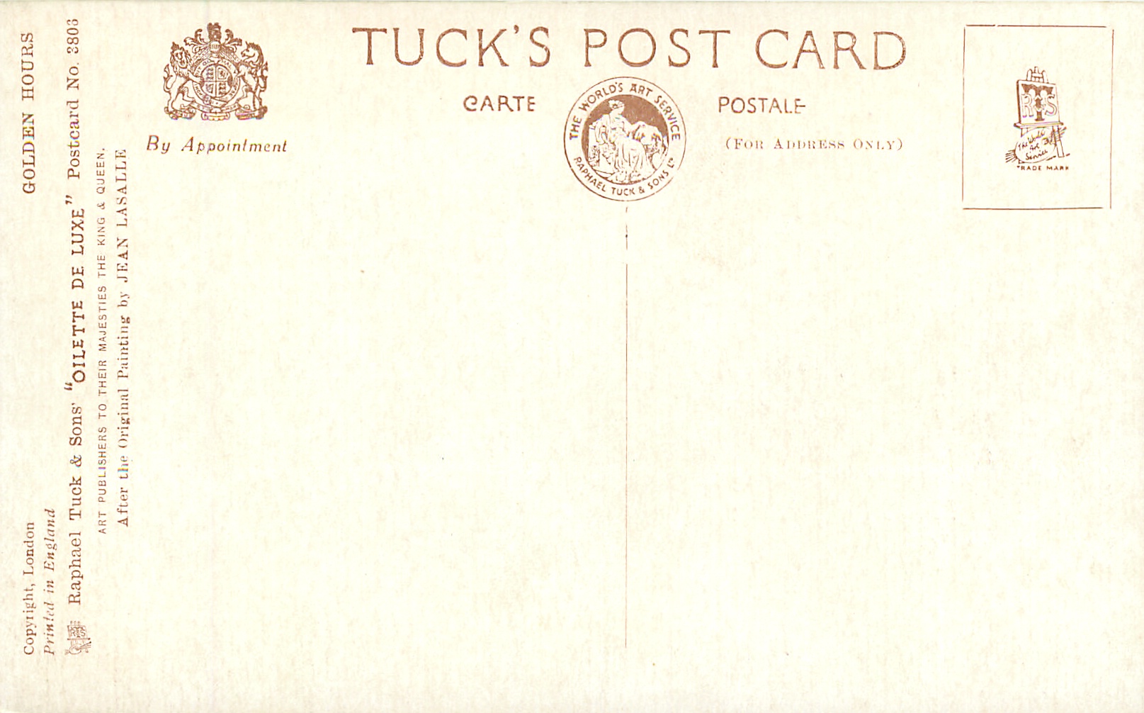 OILETTE DE LUXE, PRINTED IN ENGLAND, COPYRIGHT LONDON, comes oilfacsim but not so trade named, comes opt PICTURE on back, comes gold bevelled, AFTER THE ORIGINAL PAINTING BY JEAN LASALLE, listed in 1932 ART SERVICE Catalogue.