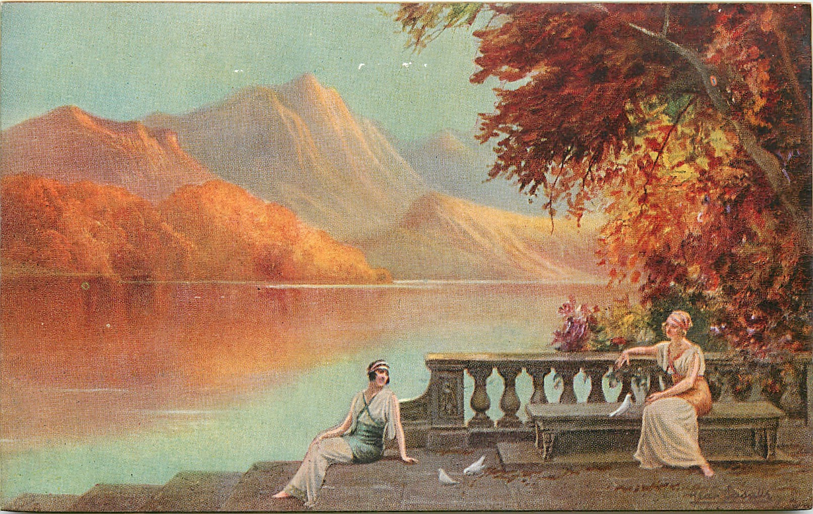 two ladies, one sitting on bench, three white doves