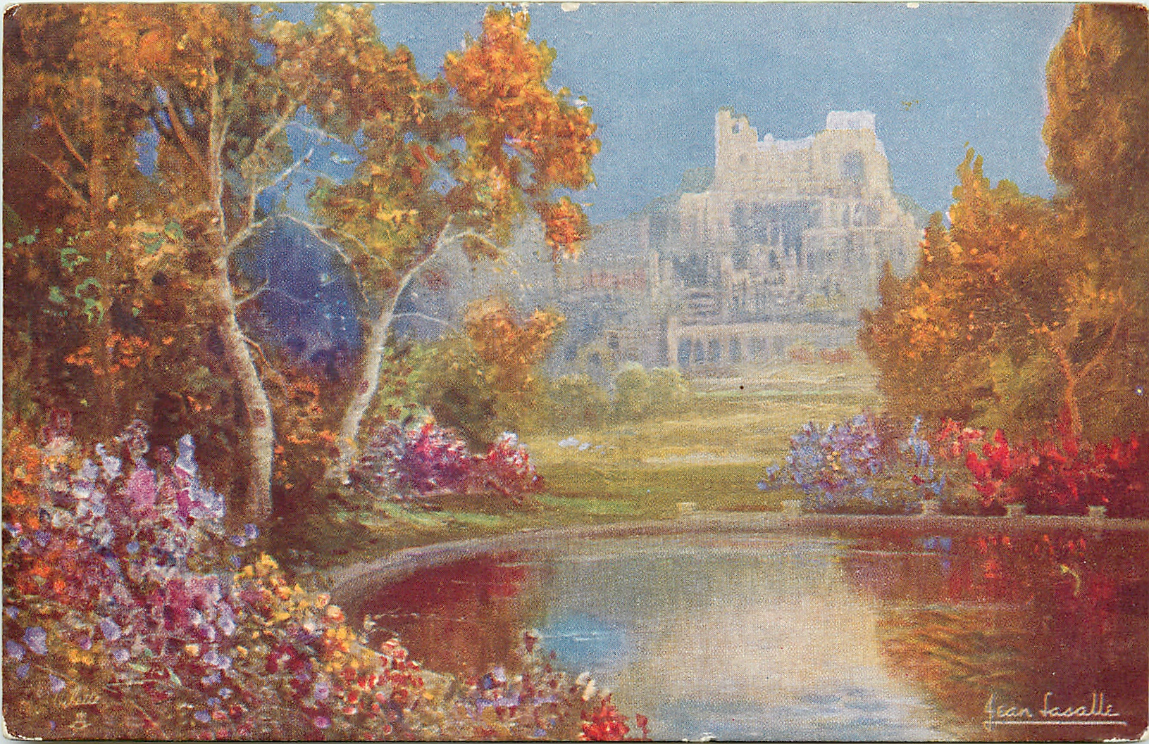 old castle in distance on right, circular lake in right foreground, flowers & trees left